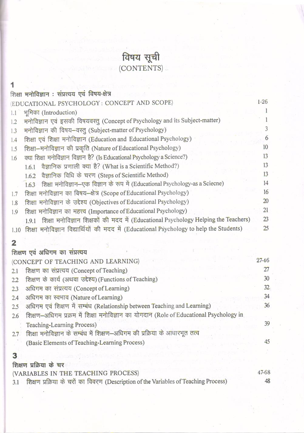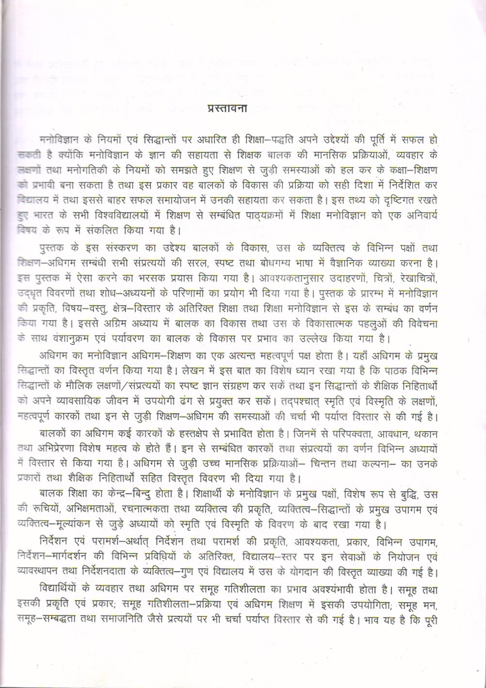 शिक्षण अधिगम सम्बंधी सभी संप्रत्ययों की सरल, स्पष्ट तथा बोधगम्य भाषा में वैज्ञानिक व्याख्या करना है इस पुस्तक में ऐसा करने का भरसक प्रयास किया गया है। आवश्यकतानुसार उदाहरणों, चित्रों, रेखाचित्र उद्धृत विवरणों तथा शोध अध्ययनों के परिणामों का प्रयोग भी दिया गया है। पुस्तक के प्रारम्भ में मनोविज्ञा की प्रकृति, विषय-वस्तु, क्षेत्र विस्तार के अतिरिक्त शिक्षा तथा शिक्षा मनोविज्ञान से इस के सम्बंध का व किया गया है। इससे अग्रिम अध्याय में बालक का विकास तथा उस के विकासात्मक पहलुओं की विवेच के साथ वंशानुक्रम एवं पर्यावरण का बालक के विकास पर प्रभाव का उल्लेख किया गया है।