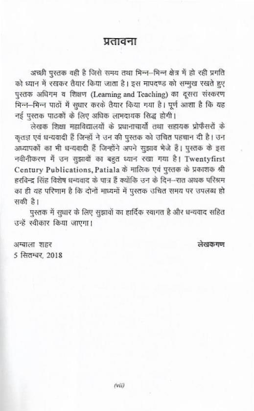 अच्छी पुस्तक वही है जिसे समय तथा भिन्न-भिन्न क्षेत्र में हो रही प्रगति को ध्यान में रखकर तैयार किया जाता है। इस मापदण्ड को सम्मुख रखते हुए पुस्तक अधिगम व शिक्षण (Learning and Teaching) का दूसरा संस्करण भिन्न-भिन्न पाठों में सुधार करके तैयार किया गया है। पूर्ण आशा है कि यह नई पुस्तक पाठकों के लिए अधिक लाभदायक सिद्ध होगी।