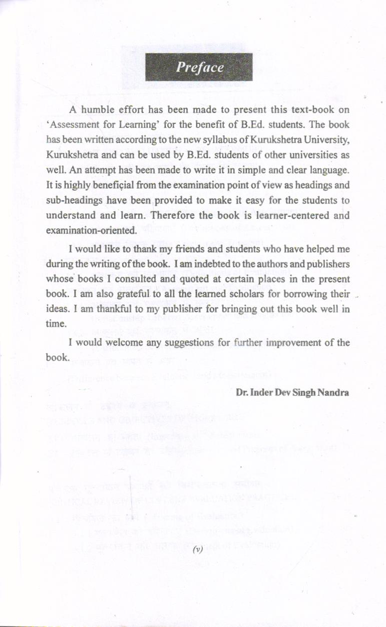 A humble effort has been made to present this text-book on ‘Assessment for Learning’ for the benefit of B.Ed. students. The book has been written according to the new syllabus of Kurukshetra University. Kurukshetra and can be used by B.Ed. students of other universities as well. An attempt has been made to write it in simple and clear language. It is highly beneficial from the examination point of view as headings and sub-headings have been provided to make it easy for the students to understand and learn. Therefore the book is learner-centered and examination-oriented.