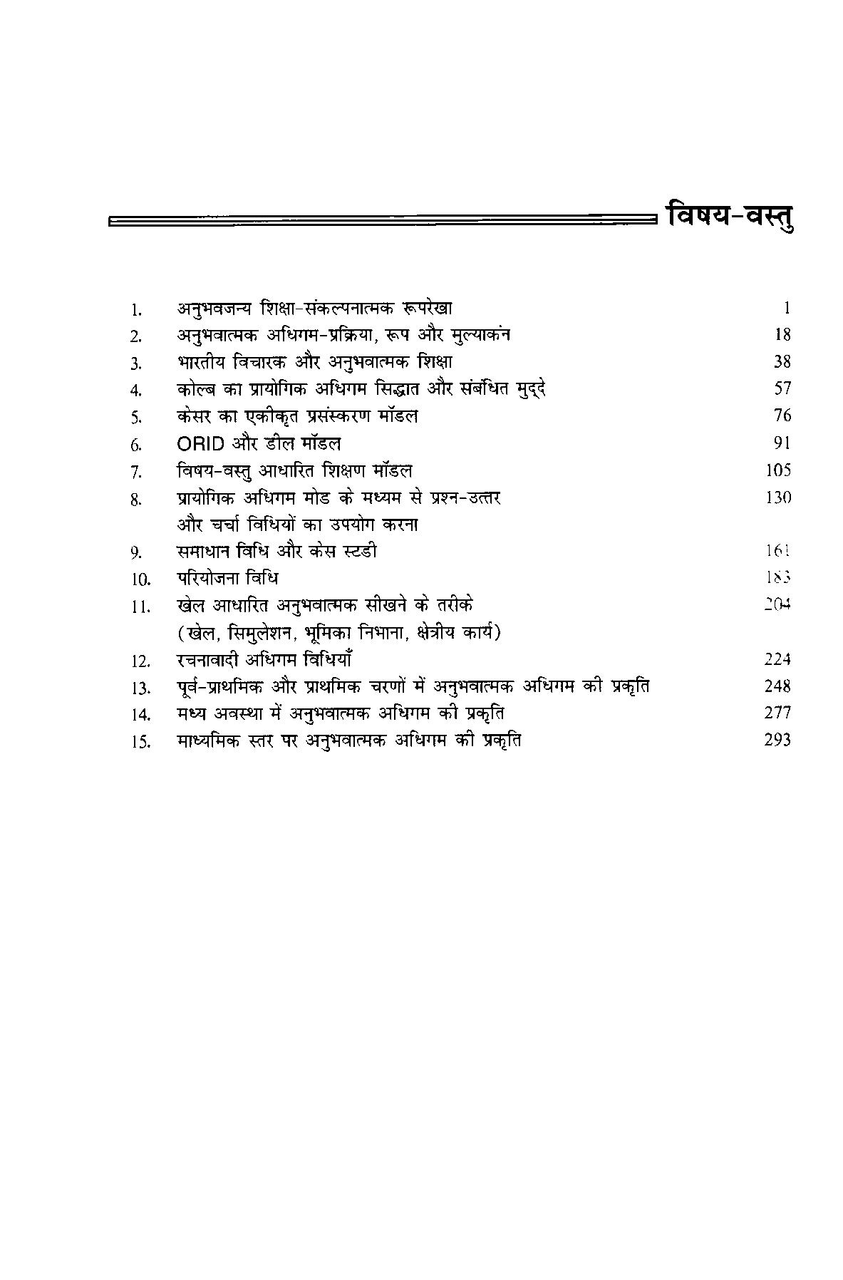 लेखक ने शिक्षाविदों और सिद्धान्तकारों के योगदान को नहीं देखा है जिन्होंने कई रणनीतियों और शिक्षण विधियों को विकसित किया है। छात्रों की भागीदारी के कुछ संवादात्मक तरीकों और रणनीतियों, जैसे प्रश्न-उत्तर विधि, चर्चा विधि, समस्या समाधान विधि, परियोजना विधि, खेल विधि और रचनावादी सीखने के तरीके-सभी पर चर्चा की गई है और उन्हें अनुभवात्मक शिक्षण अभिविन्यास से जोड़ने का प्रयास किया गया है। इन विधियों के साथ एक अध्याय जोड़ा गया है, जिसमें अनुभवात्मक अधिघम के क्षेत्र में भारतीय विचारकों के योगदान पर प्रकाश डाला गया है।