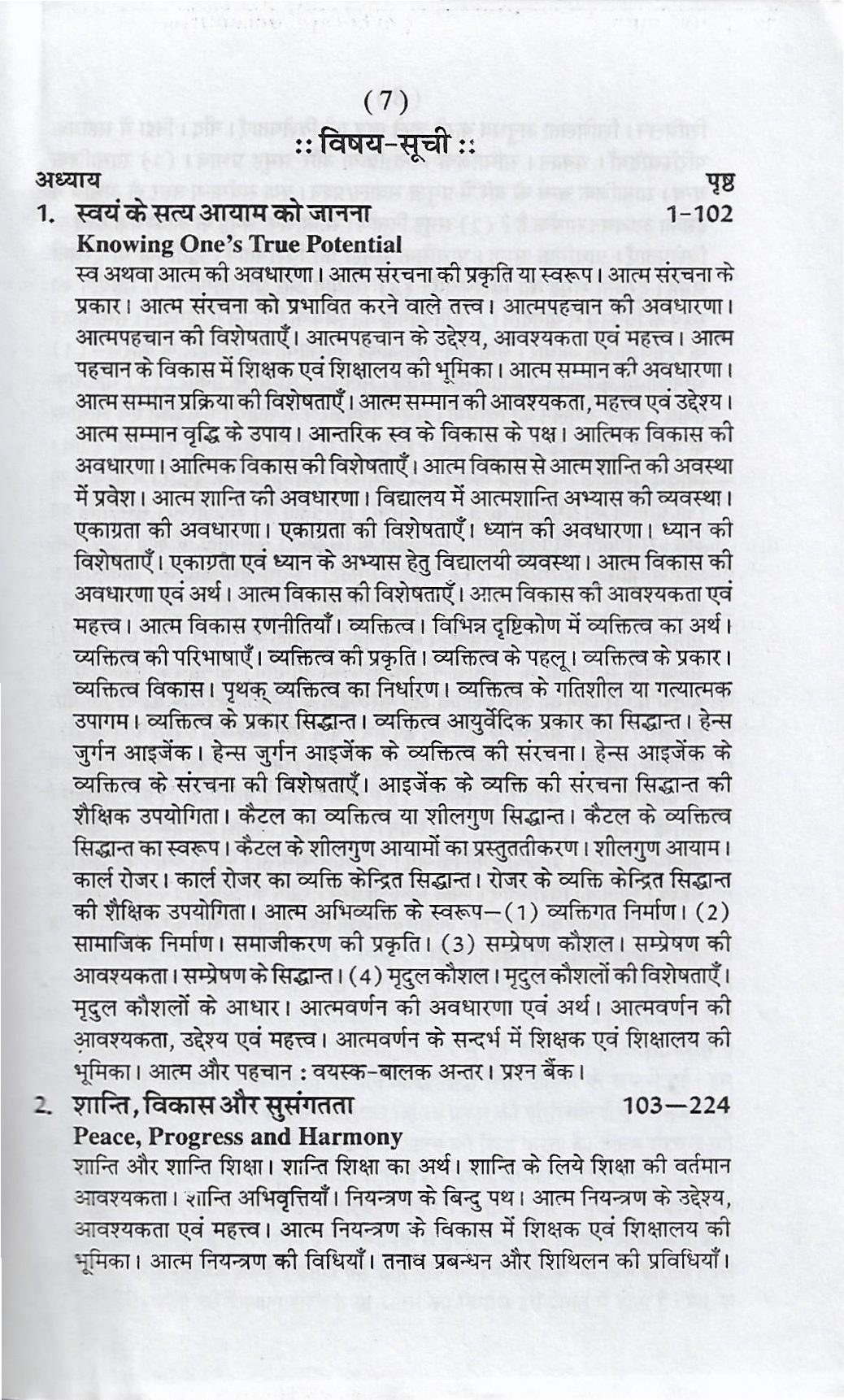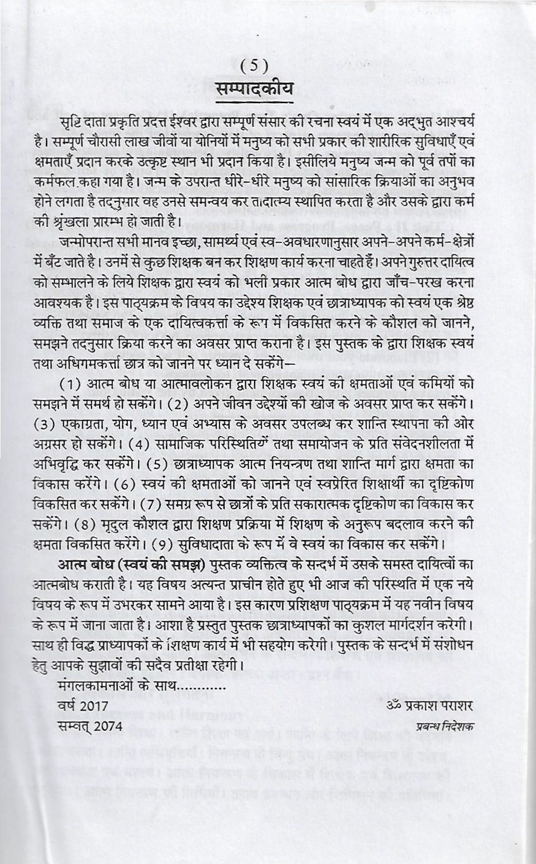 जन्मोपरान्त सभी मानव इच्छा, सामर्थ्य एवं स्व-अवधारणानुसार अपने-अपने कर्म-क्षेत्रों में बँट जाते है। उनमें से कुछ शिक्षक बन कर शिक्षण कार्य करना चाहते हैं। अपने गुरुत्तर दायित्व को सम्भालने के लिये शिक्षक द्वारा स्वयं को भली प्रकार आत्म बोध द्वारा जाँच-परख करना आवश्यक है। इस पाठ्यक्रम के विषय का उद्देश्य शिक्षक एवं छात्राध्यापक को स्वयं एक श्रेष्ठ व्यक्ति तथा समाज के एक दायित्वकर्ता के रूप में विकसित करने के कौशल को जानने, समझने तदनुसार क्रिया करने का अवसर प्राप्त कराना है। इस पुस्तक के द्वारा शिक्षक स्वयं तथा अधिगमकर्त्ता छात्र को जानने पर ध्यान दे सकेंगे-