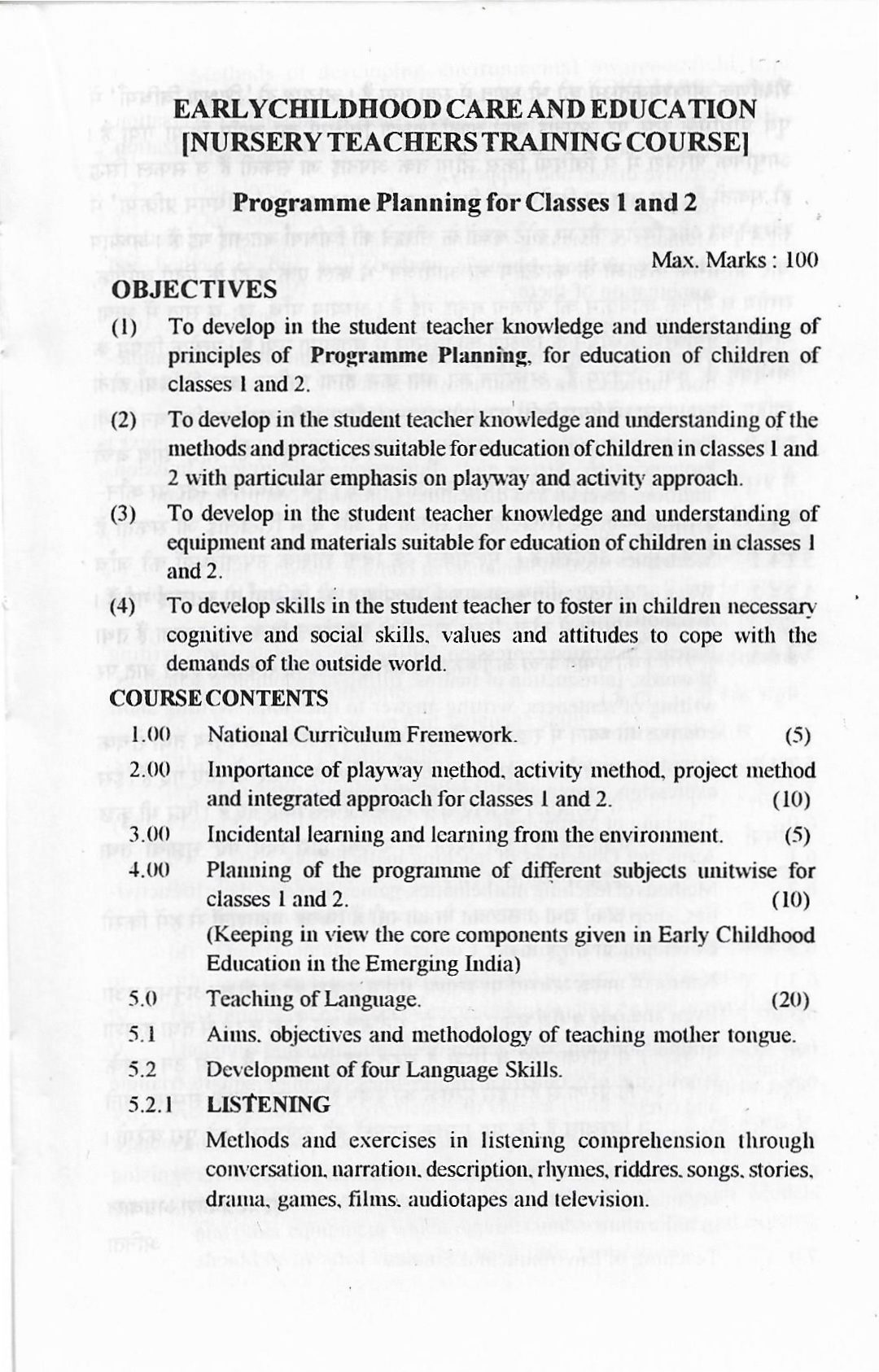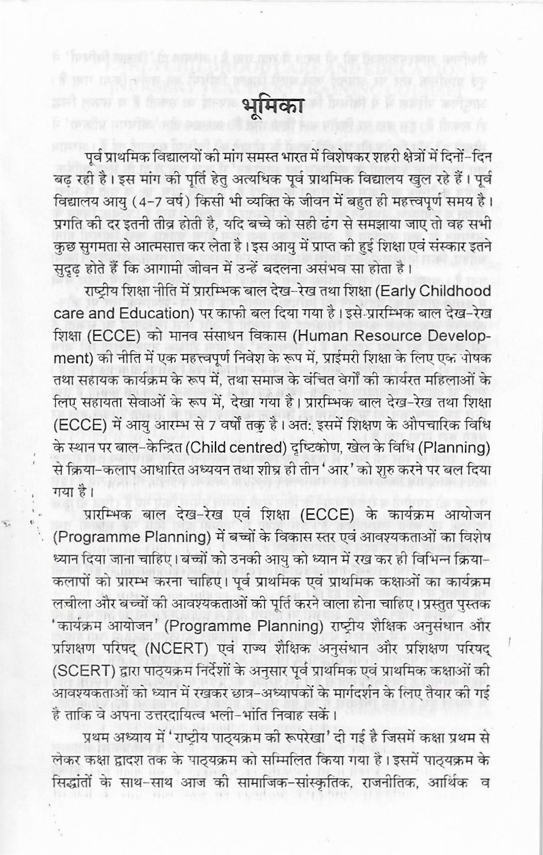 राष्ट्रीय शिक्षा नीति में प्रारम्भिक बाल देख-रेख तथा शिक्षा (Early Childhood care and Education) पर काफी बल दिया गया है। इसे प्रारम्भिक बाल देख-रेख शिक्षा (ECCE) को मानव संसाधन विकास (Human Resource Develop- ment) की नीति में एक महत्त्वपूर्ण निवेश के रूप में, प्राईमरी शिक्षा के लिए एक पोषक तथा सहायक कार्यक्रम के रूप में, तथा समाज के वंचित वर्गों की कार्यरत महिलाओं के लिए सहायता सेवाओं के रूप में, देखा गया है। प्रारम्भिक बाल देख-रेख तथा शिक्षा (ECCE) में आयु आरम्भ से 7 वर्षों तक है। अतः इसमें शिक्षण के औपचारिक विधि के स्थान पर बाल-केन्द्रित (Child centred) दृष्टिकोण, खेल के विधि (Planning) से क्रिया-कलाप आधारित अध्ययन तथा शीघ्र ही तीन ‘आर’ को शुरु करने पर बल दिया गया है। देख-रेख एवं शिक्षा (ECCE) के कार्यक्रम आयोजन