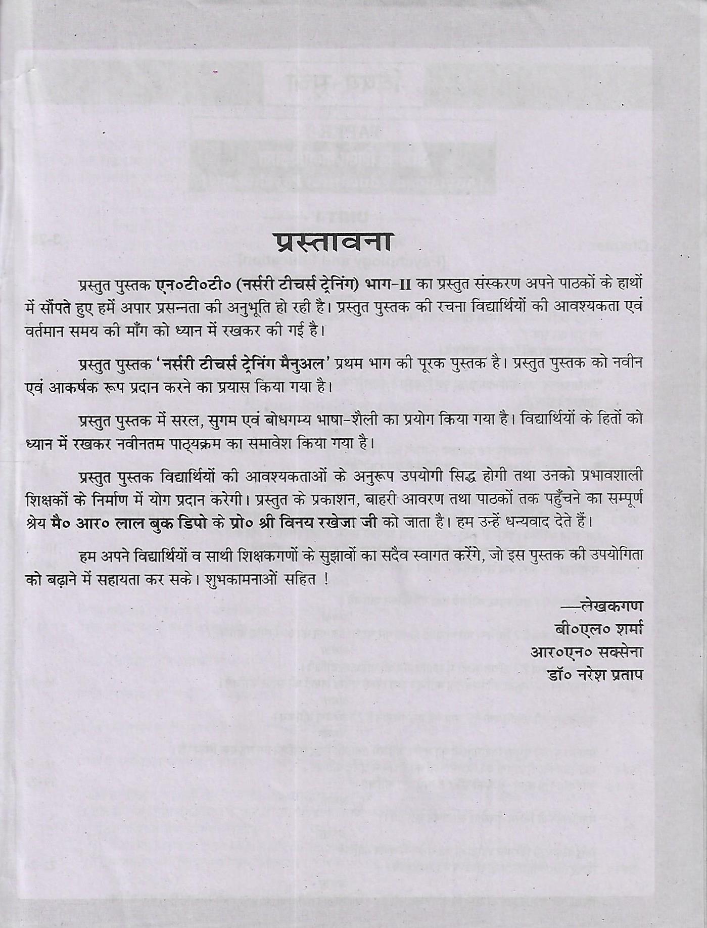 प्रस्तुत पुस्तक एन०टी०टी० (नर्सरी टीचर्स ट्रेनिंग) भाग-11 का प्रस्तुत संस्करण अपने पाठकों के हाथों | सौंपते हुए हमें अपार प्रसन्नता की अनुभूति हो रही है। प्रस्तुत पुस्तक की रचना विद्यार्थियों की आवश्यकता एवं र्तिमान समय की माँग को ध्यान में रखकर की गई है।
