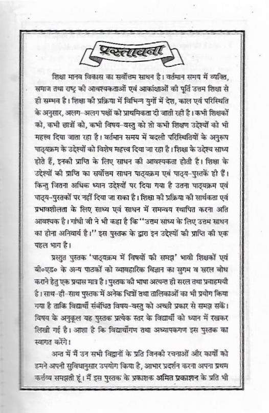 शिक्षा मानव विकास का सर्वोत्तम साधन है। वर्तमान समय में व्यक्ति, समाज तथा राष्ट्र की आवश्यकताओं एवं आकांक्षाओं की पूर्ति उत्तम शिक्षा से ही सम्भव है। शिक्षा की प्रक्रिया में विभिन्न युगों में देश, काल एवं परिस्थिति के अनुसार, अलग-अलग पक्षों को प्राथमिकता दी जाती रही है। कभी शिक्षकों को, कभी छात्रों को, कभी विषय-वस्तु को तो कभी शिक्षण उद्देश्यों को भी महत्त्व दिया जाता रहा है। वर्तमान समय में बदली परिस्थितियों के अनुरूप पाठ्यक्रम के उद्देश्यों को विशेष महत्त्व दिया जा रहा है। शिक्षा के उद्देश्य साध्य होते हैं, इनकी प्राप्ति के लिए साधन की आवश्यकता होती है। शिक्षा के उद्देश्यों की प्राप्ति का सर्वोत्तम साधन पाठ्यक्रम एवं पाठ्य-पुस्तकें ही हैं। किन्तु जितना अधिक ध्यान उद्देश्यों पर दिया गया है उतना पाठ्यक्रम एवं पाठ्य-पुस्तकों पर नहीं दिया जा सका है। शिक्षा की प्रक्रिया की सार्थकता एवं प्रभावशीलता के लिए साध्य एवं साधन में समन्वय स्थापित करना अति आवश्यक है। गांधी जी ने भी कहा है कि “उत्तम साध्य के लिए उत्तम साधन का होना अनिवार्य है।” इस पुस्तक के द्वारा इन उद्देश्यों की प्राप्ति की एक पहल भाग है।