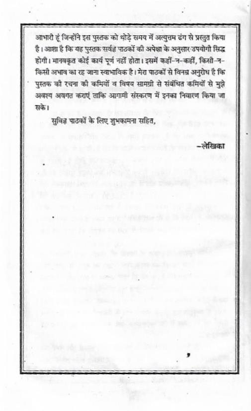 अन्त में मैं उन सभी विद्वानों के प्रति जिनकी रचनाओं और कार्यों को हमने अपनी सुविधानुसार उपयोग किया है, आभार प्रदर्शन करना अपना प्रथम कर्त्तव्य समझती हूं। मैं इस पुस्तक के प्रकाशक अमित प्रकाशन के प्रति भी