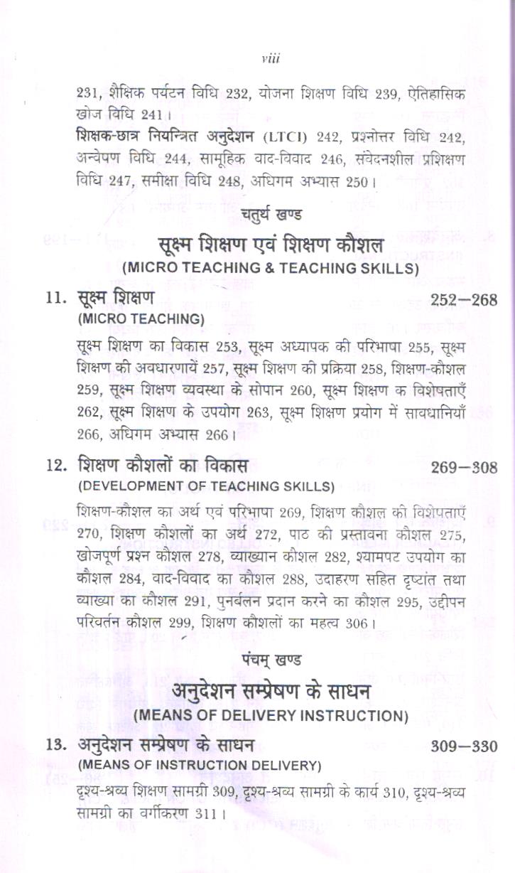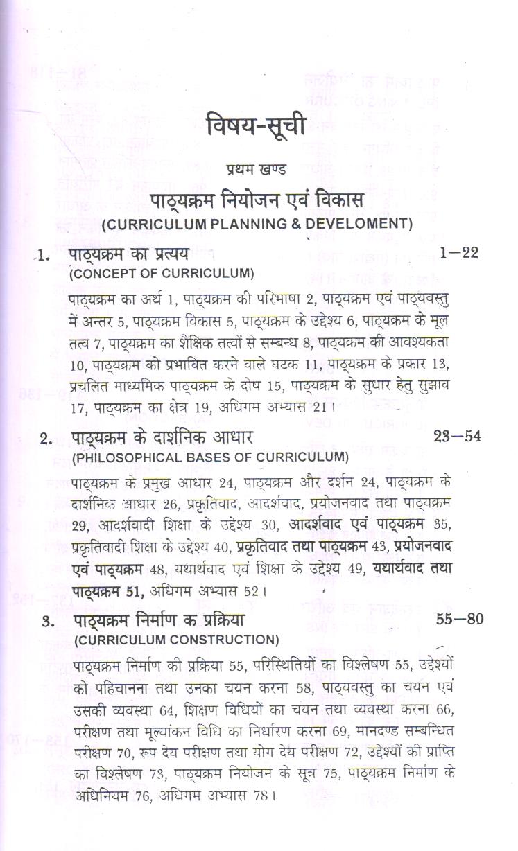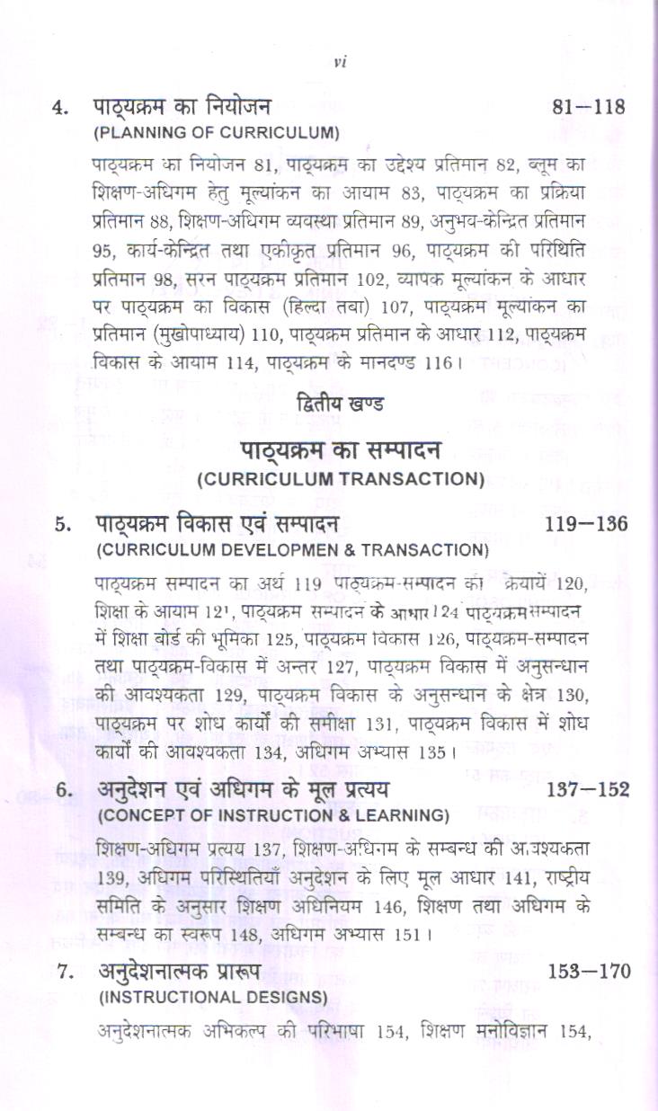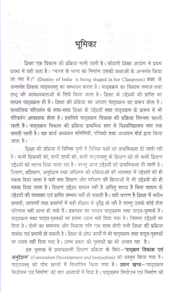 इस पुस्तक में प्रभावशाली शिक्षण प्रक्रिया के लिये- ‘पाठ्क्रम विकास एवं अनुदेशन’ (Curriculum Development and Instruction) को प्रस्तुत किया गया है। पाठ्यवस्तु को पाँच खण्डों में विभाजित किया गया है। प्रथम खण्ड-‘पाठ्यक्रम नियोजन एवं निर्माण’ को चार अध्यायों में दिया है। पाठ्यक्रम नियोजन एवं निर्माण को