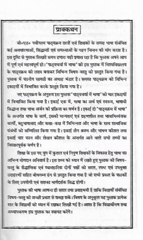 शिक्षा के इस नए युग में कुशल एवं निपुण शिक्षकों के विकास हेतु भाषा का अभिन्न योगदान अनिवार्य है। इस तथ्य को ध्यान में रखते हुए पुस्तक की विषय- वस्तु के सैद्धान्तिक एवं व्यावहारिक दोनों पक्षों को सरल, स्पष्ट एवं उपयुक्त उदाहरणों सहित बोधगम्य ढंग से प्रस्तुत किया गया है जो सभी प्रकार के पाठकों के लिए उपयोगी एवं सशक्त मार्गदर्शक सिद्ध होगी।