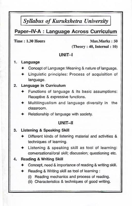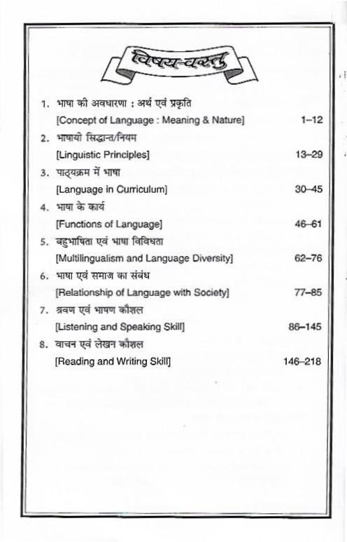 नए पाठ्यक्रम के अनुरूप इस पुस्तक ‘पाठ्यचर्या में भाषा’ को चार इकाइयों में विभाजित किया गया है। इकाई एक में, भाषा का अर्थ एवं स्वरूप, भाषायी सिद्धान्त तथा भाषा अर्जन की प्रक्रिया का वर्णन है। इकाई दो ‘पाठ्यक्रम में भाषा’ के अन्तर्गत भाषा के कार्य, इसकी मान्यताएं एवं ग्रहणशील तथा भावाभिव्यंजक कार्यों, बहुभाषावाद और कक्षा-कक्ष में विभिन्नता और भाषा के साथ सामाजिक संबंधों को सम्मिलित किया गया है। इकाई तीन श्रवण और भाषण कौशल तथा इकाई चार पठन और लेखन कौशल के अन्तर्गत आने वाले सभी तथ्यों का विस्तारपूर्वक वर्णन है।