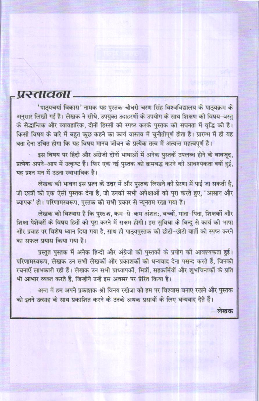 ‘पाठ्यचर्या विकास’ नामक यह पुस्तक चौधरी चरण सिंह विश्वविद्यालय के पाठ्यक्रम के अनुसार लिखी गई है। लेखक ने सीधे, उपयुक्त उदाहरणों के उपयोग के साथ शिक्षण की विषय-वस्तु के सैद्धान्तिक और व्यावहारिक, दोनों हिस्सों को स्पष्ट करके पुस्तक की सघनता में वृद्धि की है। किसी विषय के बारे में बहुत कुछ कहने का कार्य वास्तव में चुनौतीपूर्ण होता है। प्रारम्भ में ही यह बता देना उचित होगा कि यह विषय मानव जीवन के प्रत्येक तत्व में अत्यन्त महत्वपूर्ण है।