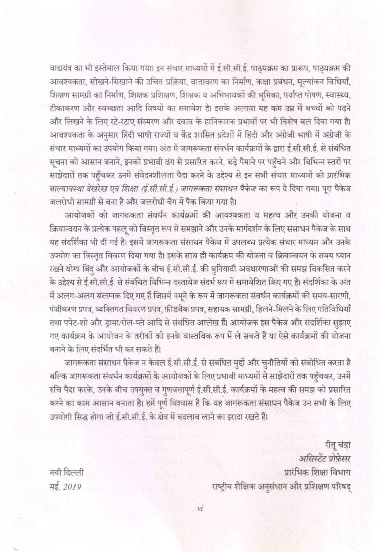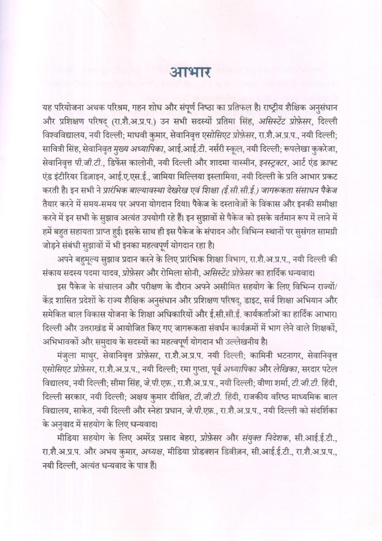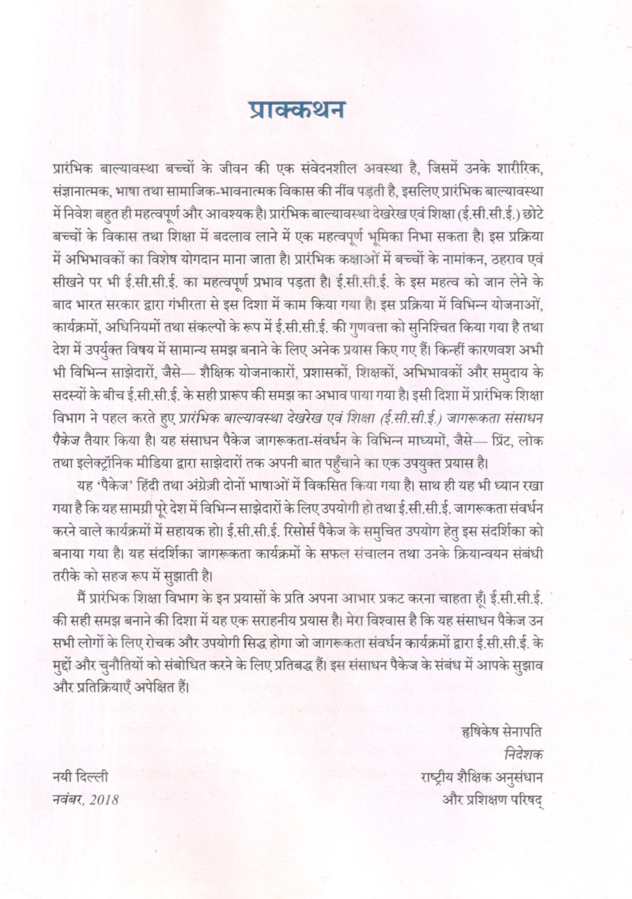 मैं प्रारंभिक शिक्षा विभाग के इन प्रयासों के प्रति अपना आभार प्रकट करना चाहता हूँ। ई.सी.सी.ई. की सही समझ बनाने की दिशा में यह एक सराहनीय प्रयास है। मेरा विश्वास है कि यह संसाधन पैकेज उन सभी लोगों के लिए रोचक और उपयोगी सिद्ध होगा जो जागरूकता संवर्धन कार्यक्रमों द्वारा ई.सी.सी.ई. के मुद्दों और चुनौतियों को संबोधित करने के लिए प्रतिबद्ध हैं। इस संसाधन पैकेज के संबंध में आपके सुझाव और प्रतिक्रियाएँ अपेक्षित हैं।
