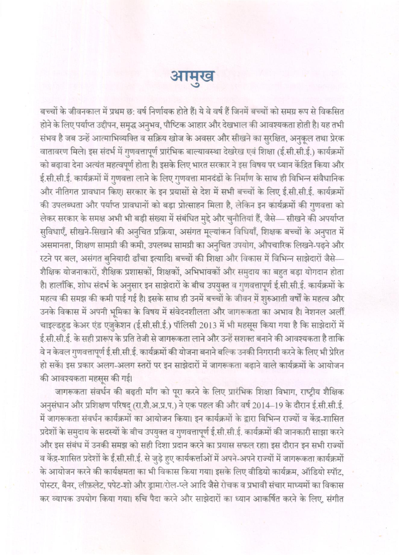 प्रारंभिक बाल्यावस्था बच्चों के जीवन की एक संवेदनशील अवस्था है, जिसमें उनके शारीरिक, संज्ञानात्मक, भाषा तथा सामाजिक-भावनात्मक विकास की नींव पड़ती है, इसलिए प्रारंभिक बाल्यावस्था में निवेश बहुत ही महत्वपूर्ण और आवश्यक है। प्रारंभिक बाल्यावस्था देखरेख एवं शिक्षा (ई.सी.सी.ई.) छोटे बच्चों के विकास तथा शिक्षा में बदलाव लाने में एक महत्वपूर्ण भूमिका निभा सकता है। इस प्रक्रिया में अभिभावकों का विशेष योगदान माना जाता है। प्रारंभिक कक्षाओं में बच्च्चों के नामांकन, ठहराव एवं सीखने पर भी ई.सी.सी.ई. का महत्वपूर्ण प्रभाव पड़ता है। ई.सी.सी.ई. के इस महत्व को जान लेने के बाद भारत सरकार द्वारा गंभीरता से इस दिशा में काम किया गया है। इस प्रक्रिया में विभिन्न योजनाओं, कार्यक्रमों, अधिनियमों तथा संकल्पों के रूप में ई.सी.सी.ई. की गुणवत्ता को सुनिश्चित किया गया है तथा देश में उपर्युक्त विषय में सामान्य समझ बनाने के लिए अनेक प्रयास किए गए हैं। किन्हीं कारणवश अभी भी विभिन्न साझेदारों, जैसे- शैक्षिक योजनाकारों, प्रशासकों, शिक्षकों, अभिभावकों और समुदाय के सदस्यों के बीच ई.सी.सी.ई. के सही प्रारूप की समझ का अभाव पाया गया है। इसी दिशा में प्रारंभिक शिक्षा विभाग ने पहल करते हुए प्रारंभिक बाल्यावस्था देखरेख एवं शिक्षा (ई.सी.सी.ई.) जागरूकता संसाधन पैकेज तैयार किया है। यह संसाधन पैकेज जागरूकता-संवर्धन के विभिन्न माध्यमों, जैसे प्रिंट, लोक तथा इलेक्ट्रॉनिक मीडिया द्वारा साझेदारों तक अपनी बात पहुँचाने का एक उपयुक्त प्रयास है।
