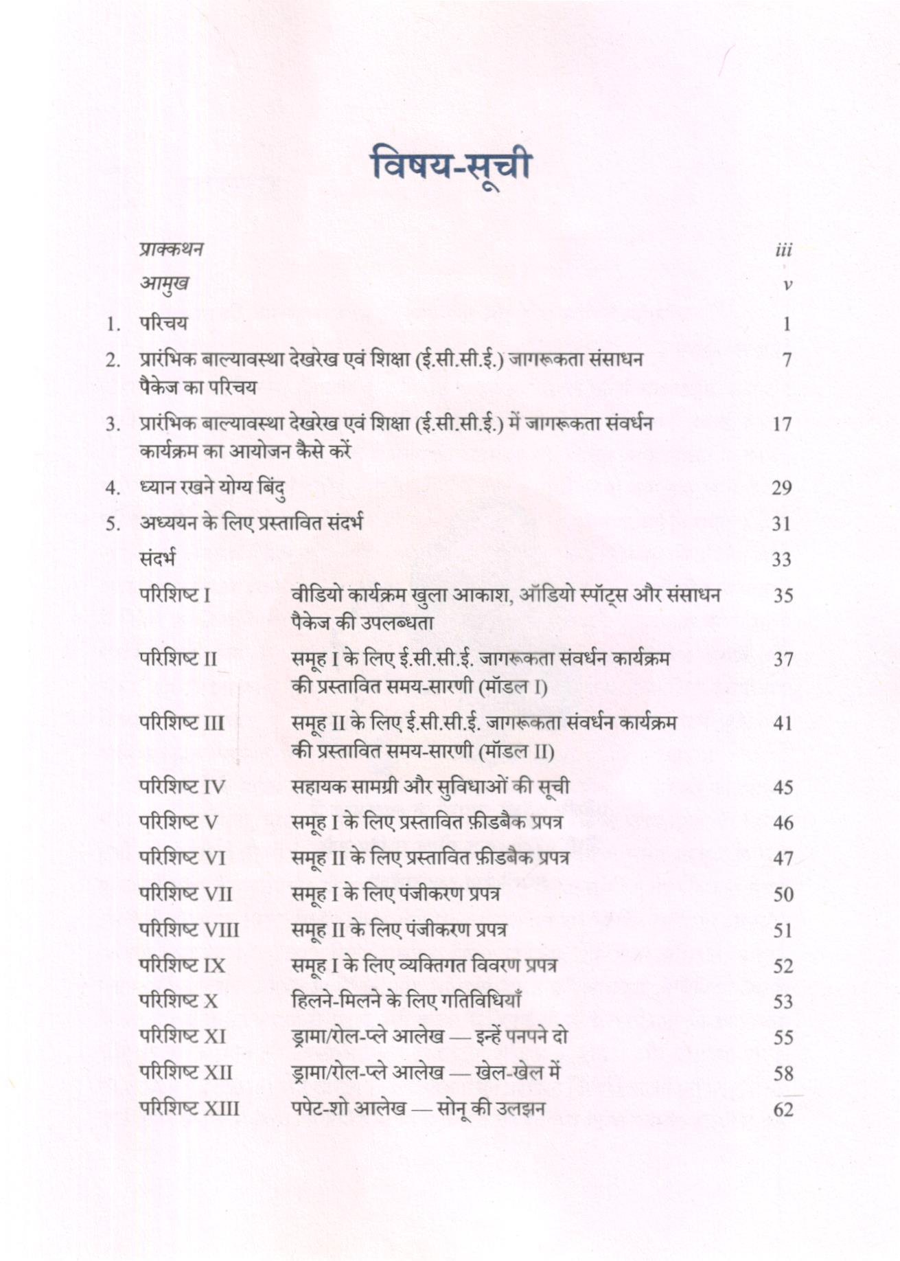 यह ‘पैकेज’ हिंदी तथा अंग्रेज़ी दोनों भाषाओं में विकसित किया गया है। साथ ही यह भी ध्यान रखा गया है कि यह सामग्री पूरे देश में विभिन्न साझेदारों के लिए उपयोगी हो तथा ई.सी.सी.ई. जागरूकता संवर्धन करने वाले कार्यक्रमों में सहायक हो। ई.सी.सी.ई. रिसोर्स पैकेज के समुचित उपयोग हेतु इस संदर्शिका को बनाया गया है। यह संदर्शिका जागरूकता कार्यक्रमों के सफल संचालन तथा उनके क्रियान्वयन संबंधी तरीके को सहज रूप में सुझाती है।