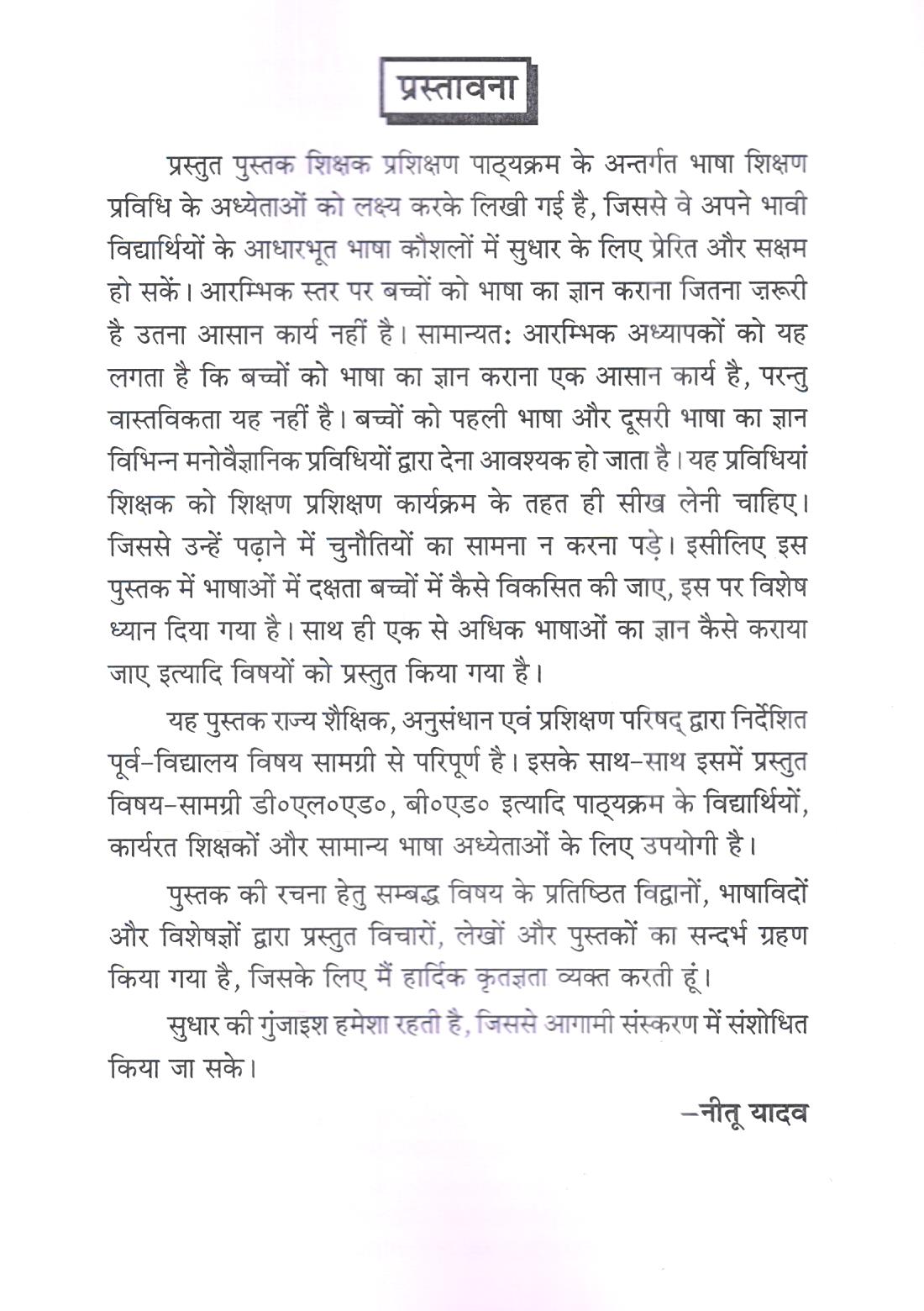 प्रस्तुत पुस्तक शिक्षक प्रशिक्षण पाठ्यक्रम के अन्तर्गत भाषा शिक्षण प्रविधि के अध्येताओं को लक्ष्य करके लिखी गई है, जिससे वे अपने भावी विद्यार्थियों के आधारभूत भाषा कौशलों में सुधार के लिए प्रेरित और सक्षम हो सकें। आरम्भिक स्तर पर बच्चों को भाषा का ज्ञान कराना जितना जरूरी है उतना आसान कार्य नहीं है। सामान्यतः आरम्भिक अध्यापकों को यह लगता है कि बच्चों को भाषा का ज्ञान कराना एक आसान कार्य है, परन्तु वास्तविकता यह नहीं है। बच्चों को पहली भाषा और दूसरी भाषा का ज्ञान विभिन्न मनोवैज्ञानिक प्रविधियों द्वारा देना आवश्यक हो जाता है। यह प्रविधियां शिक्षक को शिक्षण प्रशिक्षण कार्यक्रम के तहत ही सीख लेनी चाहिए। जिससे उन्हें पढ़ाने में चुनौतियों का सामना न करना पड़े। इसीलिए इस पुस्तक में भाषाओं में दक्षता बच्चों में कैसे विकसित की जाए, इस पर विशेष ध्यान दिया गया है। साथ ही एक से अधिक भाषाओं का ज्ञान कैसे कराया जाए इत्यादि विषयों को प्रस्तुत किया गया है।