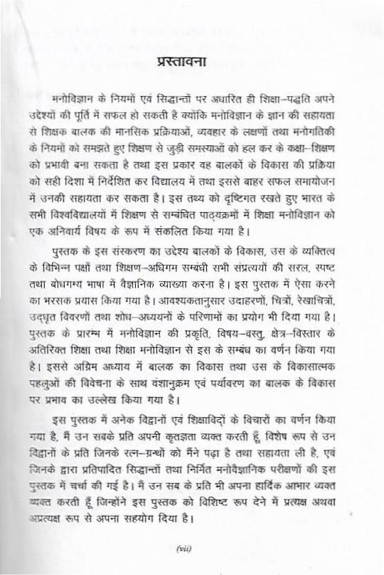 इस पुस्तक में अनेक विद्वानों एवं शिक्षाविदों के विचारों का वर्णन किया गया है, मैं उन सबके प्रति अपनी कृतज्ञता व्यक्त करती हूँ, विशेष रूप से उन विद्वानों के प्रति जिनके रत्न-ग्रन्थों को मैंने पढ़ा है तथा सहायता ली है, एवं जिनके द्वारा प्रतिपादित सिद्धान्तों तथा निर्मित मनोवैज्ञानिक परीक्षणों की इस पुस्तक में चर्चा की गई है। मैं उन सब के प्रति भी अपना हार्दिक आभार व्यक्त व्यक्त करती हूँ जिन्होंने इस पुस्तक को विशिष्ट रूप देने में प्रत्यक्ष अथवा अप्रत्यक्ष रूप से अपना सहयोग दिया है।