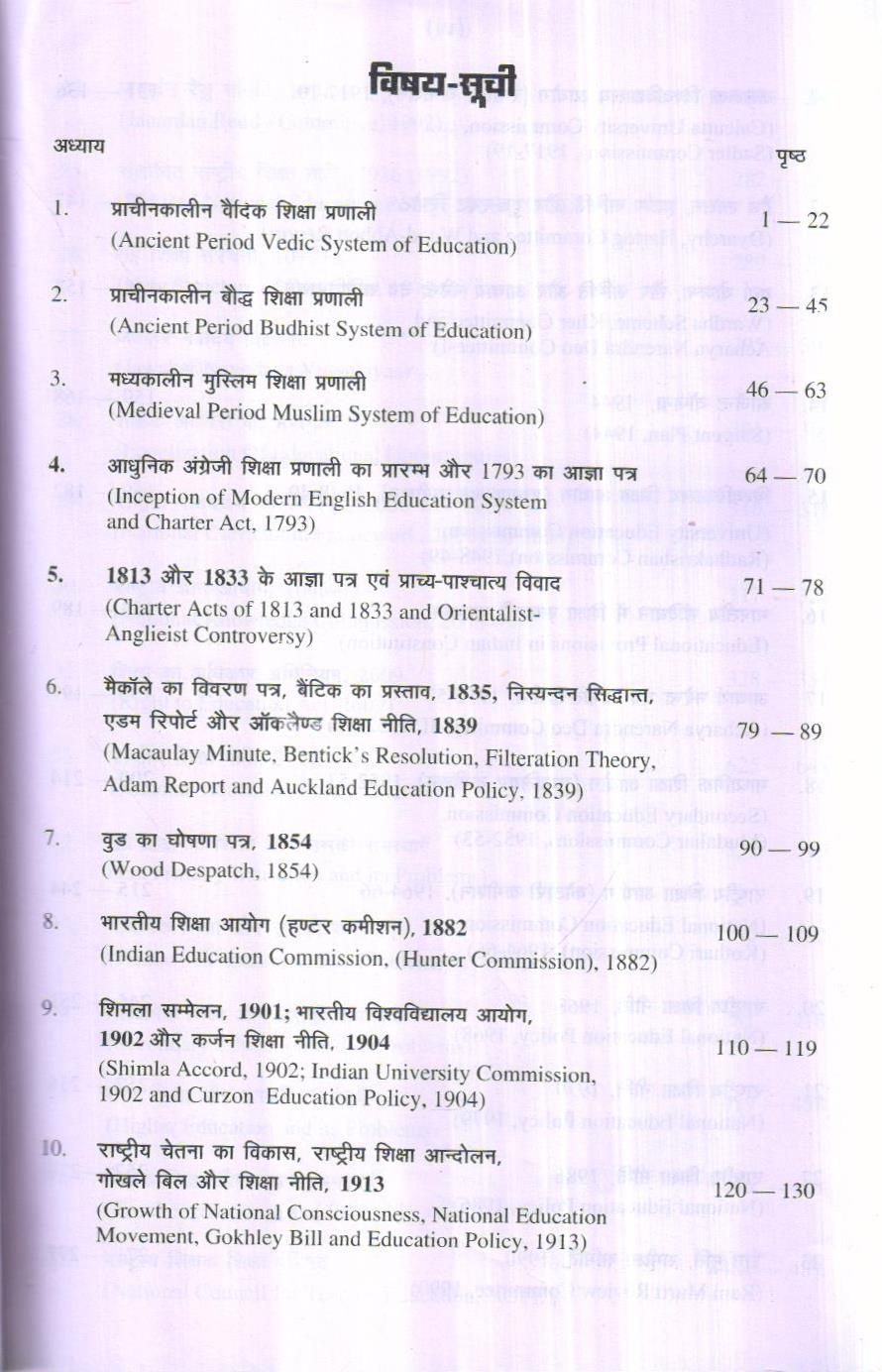 इतिहास का अध्ययन कालक्रमानुसार किया जाता है और किसी काल के इतिहास का अध्ययन एक विशेष तार्किक क्रम में किया जाता है। इस क्रम के अभाव में ऐतिहासिक तथ्यों को समझना और स्मरण रखना कठिन होता है। तब भारतीय शिक्षा के इतिहास का अध्ययन भी कालक्रमानुसार किया जाना चाहिए और किसी काल की शिक्षा प्रणाली का अध्ययन एक विशेष तार्किक क्रम में किया जाना चाहिए। इस पुस्तक में कुछ ऐसा ही प्रयास किया गया है।