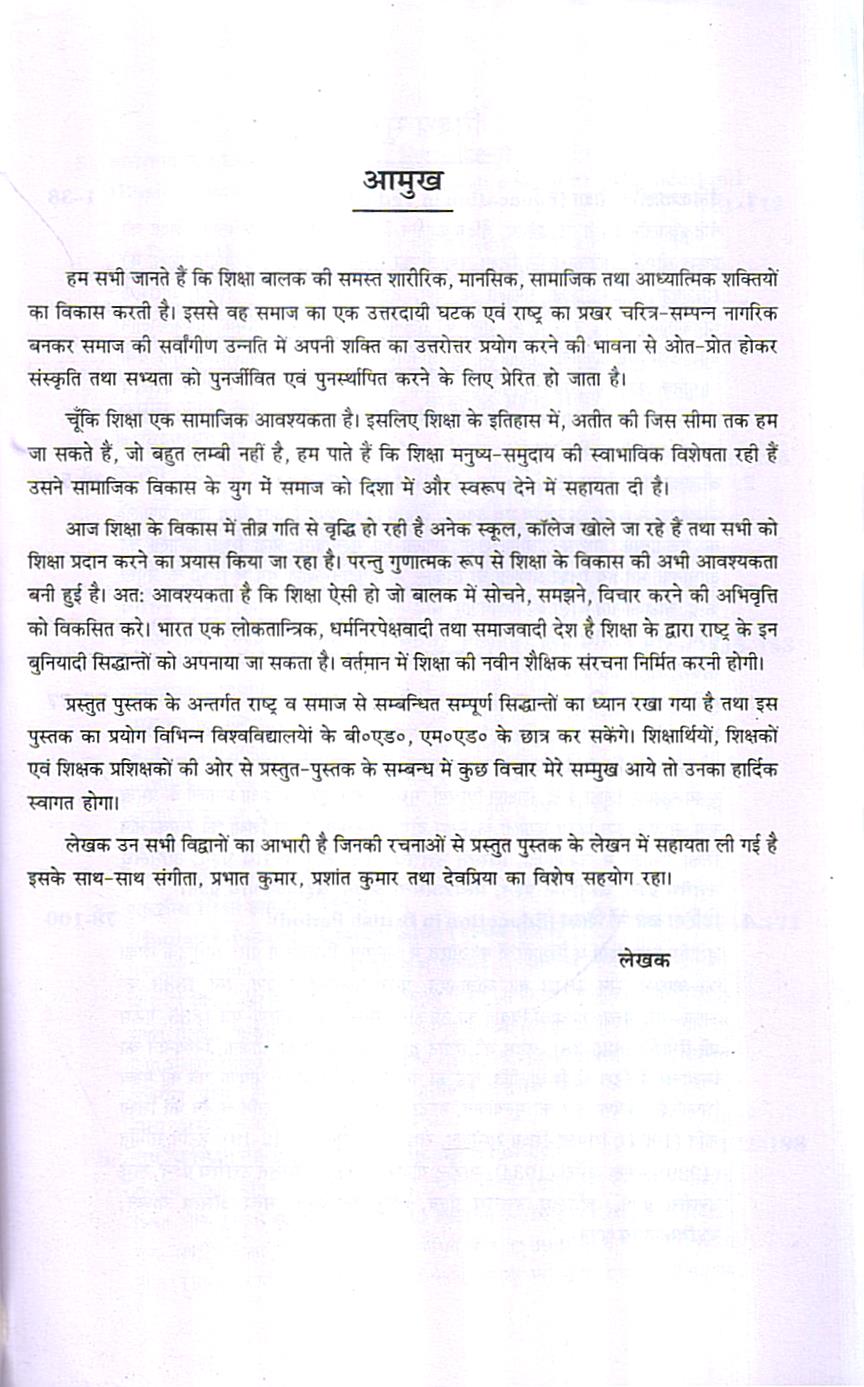 प्रस्तुत पुस्तक के अन्तर्गत राष्ट्र व समाज से सम्बन्धित सम्पूर्ण सिद्धान्तों का ध्यान रखा गया है तथा इस पुस्तक का प्रयोग विभिन्न विश्वविद्यालयों के बी०एड०, एम०एड० के छात्र कर सकेंगे। शिक्षार्थियों, शिक्षकों एवं शिक्षक प्रशिक्षकों की ओर से प्रस्तुत पुस्तक के सम्बन्ध में कुछ विचार मेरे सम्मुख आये तो उनका हार्दिक स्वागत होगा।