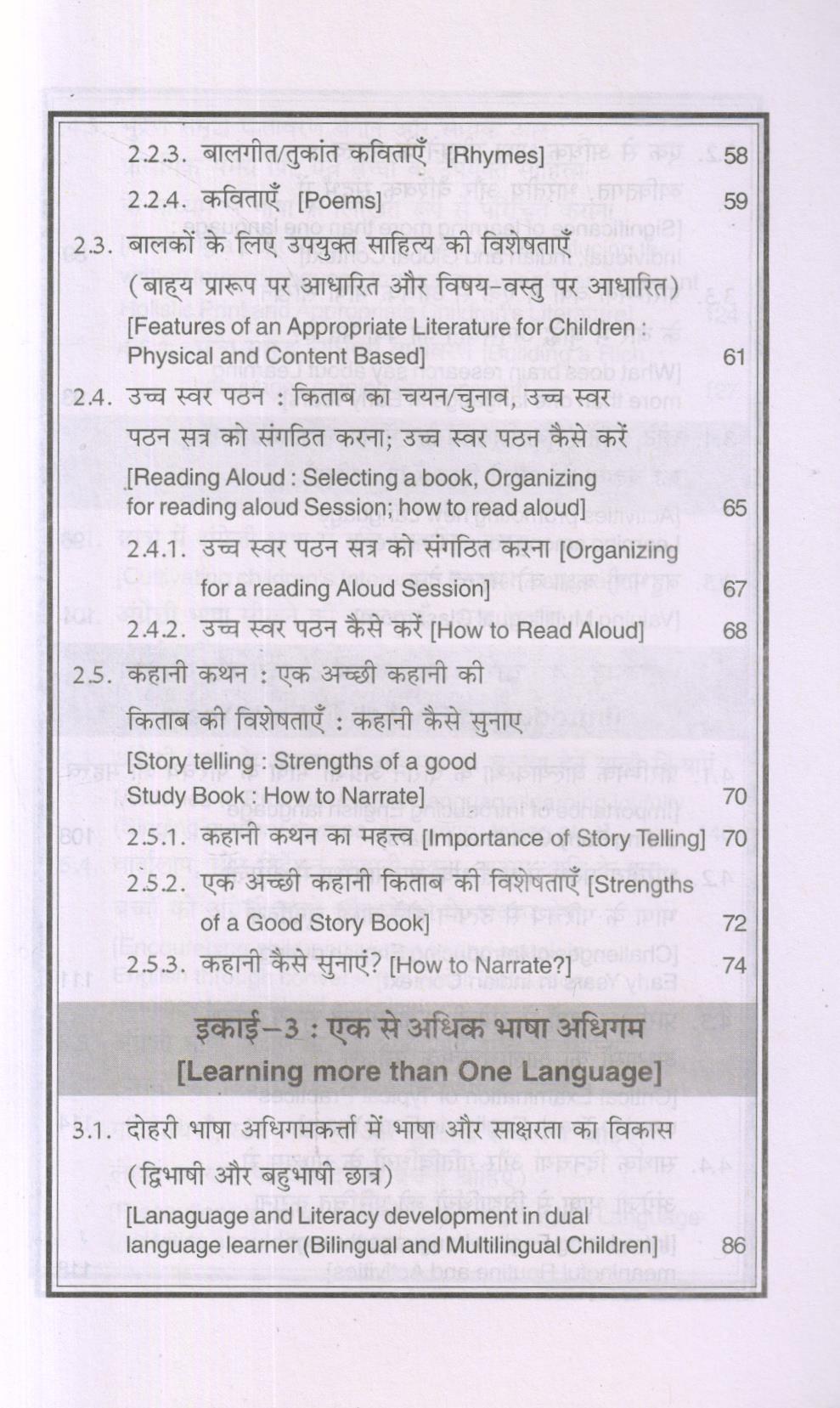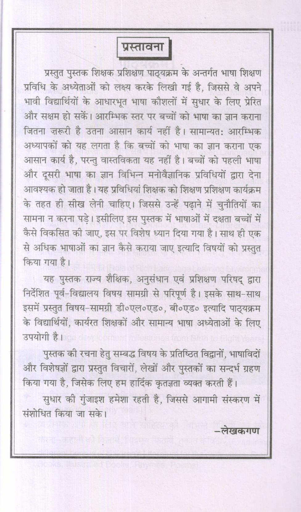 यह पुस्तक राज्य शैक्षिक, अनुसंधान एवं प्रशिक्षण परिषद् द्वारा निर्देशित पूर्व-विद्यालय विषय सामग्री से परिपूर्ण है। इसके साथ-साथ इसमें प्रस्तुत विषय-सामग्री डी०एल०एड०, बी०एड० इत्यादि पाठ्यक्रम के विद्यार्थियों, कार्यरत शिक्षकों और सामान्य भाषा अध्येताओं के लिए उपयोगी है।