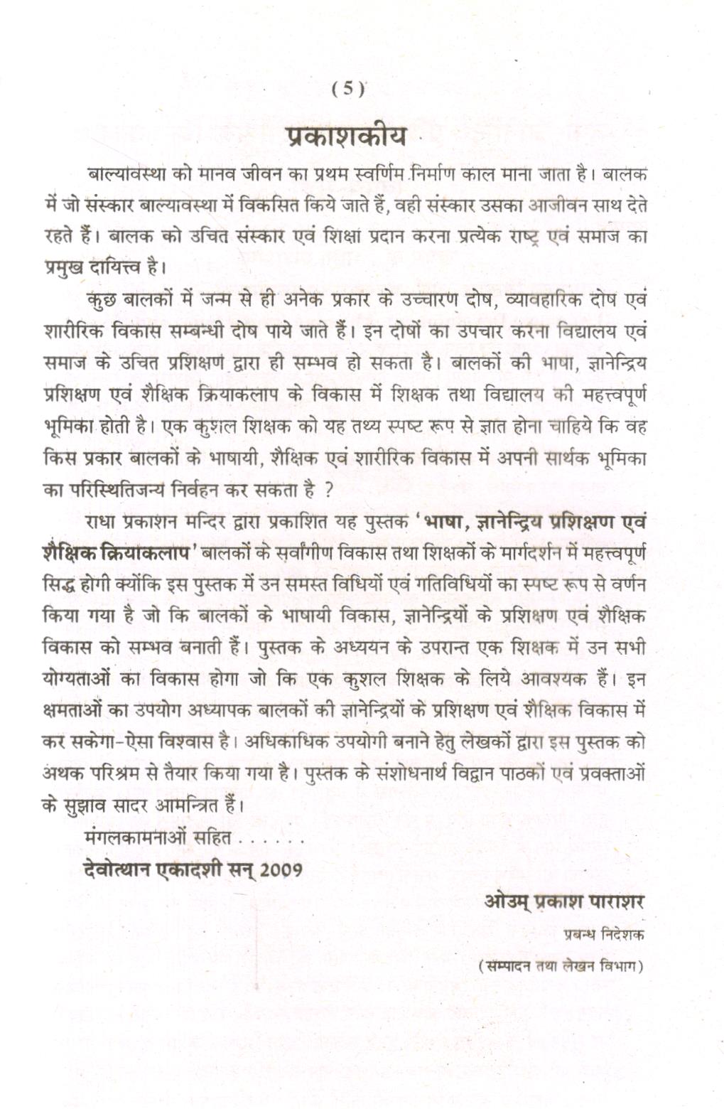 राधा प्रकाशन मन्दिर द्वारा प्रकाशित यह पुस्तक ‘भाषा, ज्ञानेन्द्रिय प्रशिक्षण एवं शैक्षिक क्रियाकलाप’ बालकों के सर्वांगीण विकास तथा शिक्षकों के मार्गदर्शन में महत्त्वपूर्ण सिद्ध होगी क्योंकि इस पुस्तक में उन समस्त विधियों एवं गतिविधियों का स्पष्ट रूप से वर्णन किया गया है जो कि बालकों के भाषायी विकास, ज्ञानेन्द्रियों के प्रशिक्षण एवं शैक्षिक विकास को सम्भव बनाती हैं। पुस्तक के अध्ययन के उपरान्त एक शिक्षक में उन सभी योग्यताओं का विकास होगा जो कि एक कुशल शिक्षक के लिये आवश्यक हैं। इन क्षमताओं का उपयोग अध्यापक बालकों की ज्ञानेन्द्रियों के प्रशिक्षण एवं शैक्षिक विकास में कर सकेगा-ऐसा विश्वास है। अधिकाधिक उपयोगी बनाने ह