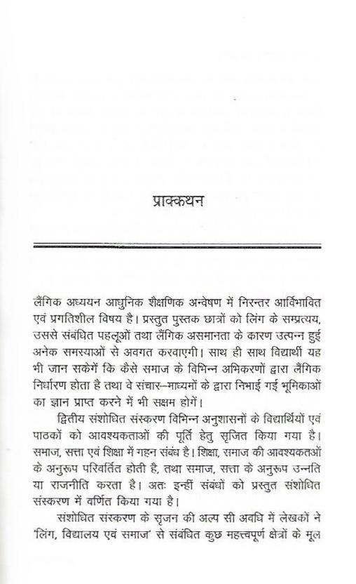 संशोधित संस्करण के सृजन की अल्प सी अवधि में लेखकों ने ‘लिंग, विद्यालय एवं समाज’ से संबंधित कुछ महत्त्वपूर्ण क्षेत्रों के मूल तत्त्वों को समाहित करने का प्रयास किया है। इस प्रयास में लेखकों ने शब्दाडंबरों से बचने की अथाह कोशिश कि है एवं पाठकों का ध्यान विषय से सम्बन्धित आवश्यक बिन्दुओं पर केन्द्रित किया है। इस प्रक्रिया में उनका कार्य कुछ सतर्कतापूर्ण हो गया है, क्योंकि मूलभूत तत्त्व विभिन्न मानक स्रोतों से उगाहे गए हैं, जो कि सन्दर्भ ग्रंथ-सूची में विरचित हैं। इस संस्करण को पाठकों के सामने प्रस्तुत करते हुए यह प्रयास किए गए हैं कि भारतीय पृष्ठभूमि केन्द्र में रहे, परन्तु साथ ही साथ समग्र अवलोकन यह भी किया गया है कि पुस्तक का सर्वव्यापी चरित्र भी अनिवार्य रूप से सुरक्षित रहे।
