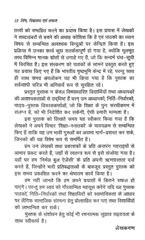 प्रस्तुत पुस्तक न केवल विषयाधारित विद्यार्थियों तथा अध्यापकों की आवश्यकताओं से उद्दिष्ट हैं वरन् उन अध्यापकों, निर्ति-निर्धारकों, पाठ्य-पुस्तक विकासकर्ताओं, जो कि शिक्षा के पुनः संरचीकरण में संलग्न हैं, को भी निदेर्शित कर सकेगी, ऐसी हमारी मान्यता है। इस पुस्तक को लिखते समय यह स्वीकार किया गया है कि लेखकों ने अपने विचार शिक्षा-स्नातकों के पाठ्यक्रम से सम्बन्धित किए हैं ताकि यह उन भावी गुरुओं का अवश्य मार्ग प्रशस्त कर सके, जिनको की यह विषेष रूप से समर्पित है। हम उन लेखकों तथा प्रकाशकों के प्रति अन्तरंग गहराइयों से आभार प्रकट करते हैं, जहाँ से स्वतन्त्र रूप से इसे संजोया गया है। यहाँ पर हम ‘निर्मल बुल ऐजेंसी’ के प्रति अपनी ऋणग्रस्तता दर्ज करते हैं, जिन्होंने भारी प्रतिबद्धताओं के बावजूद प्रस्तुत पुस्तक को इस समय प्रकाशित करने का श्रेष्ठतम कार्य किया है। हम नहीं जानते कि हम अपने प्रयासों में कितने सफल हो पाएंगे। परन्तु हम स्वयं को गौरवान्वित महसूस करेंगे यदि यह पुस्तक पाठको, निति-निर्धारकों तथा शिक्षाविदों को स्वाभाविकता के आधार पर लैंगिक सामाजिक संरचना हेतु प्रोत्साहित कर पाए तथा विद्यार्थियों को लाभान्वित कर सके। पुस्तक के संशोधन हेतु कोई भी रचनात्मक सुझाव सहृदयता के साथ स्वीकार्य है।