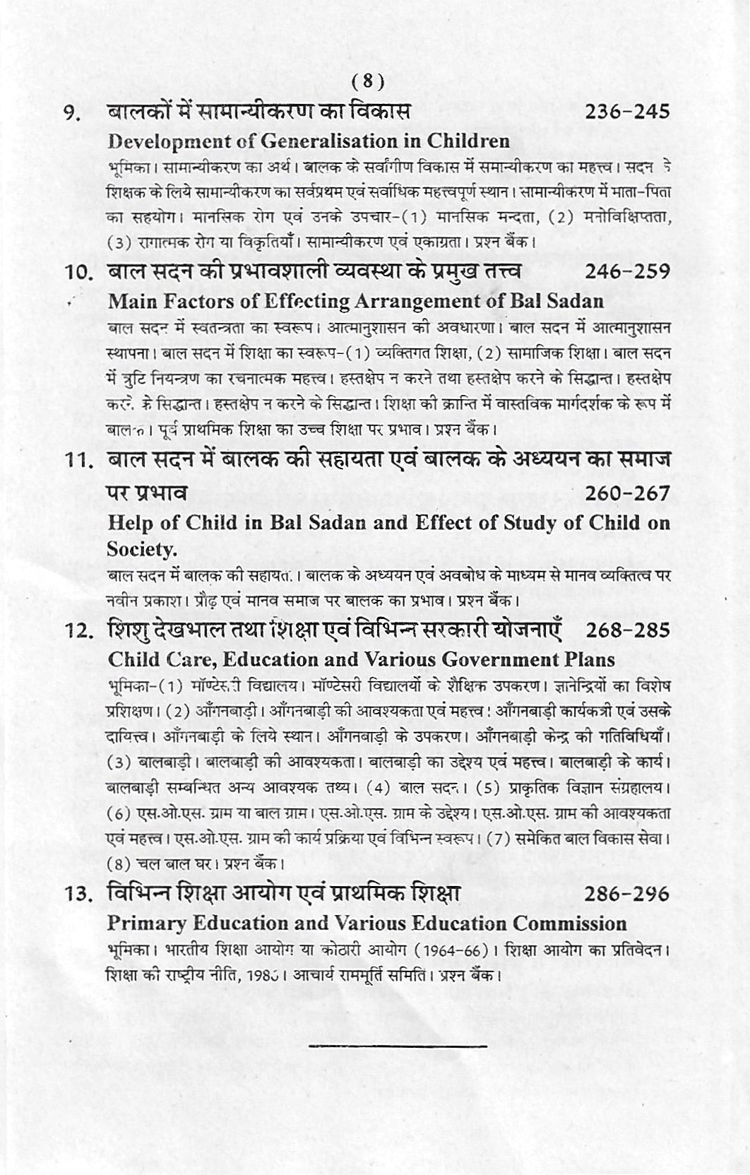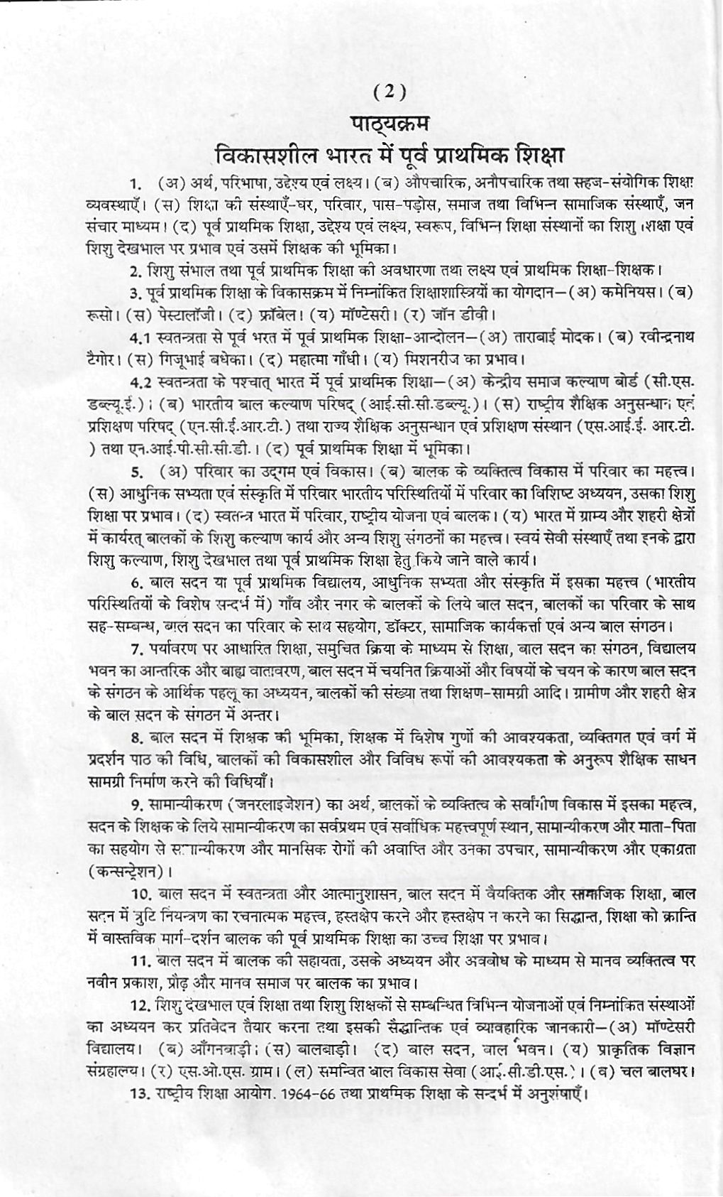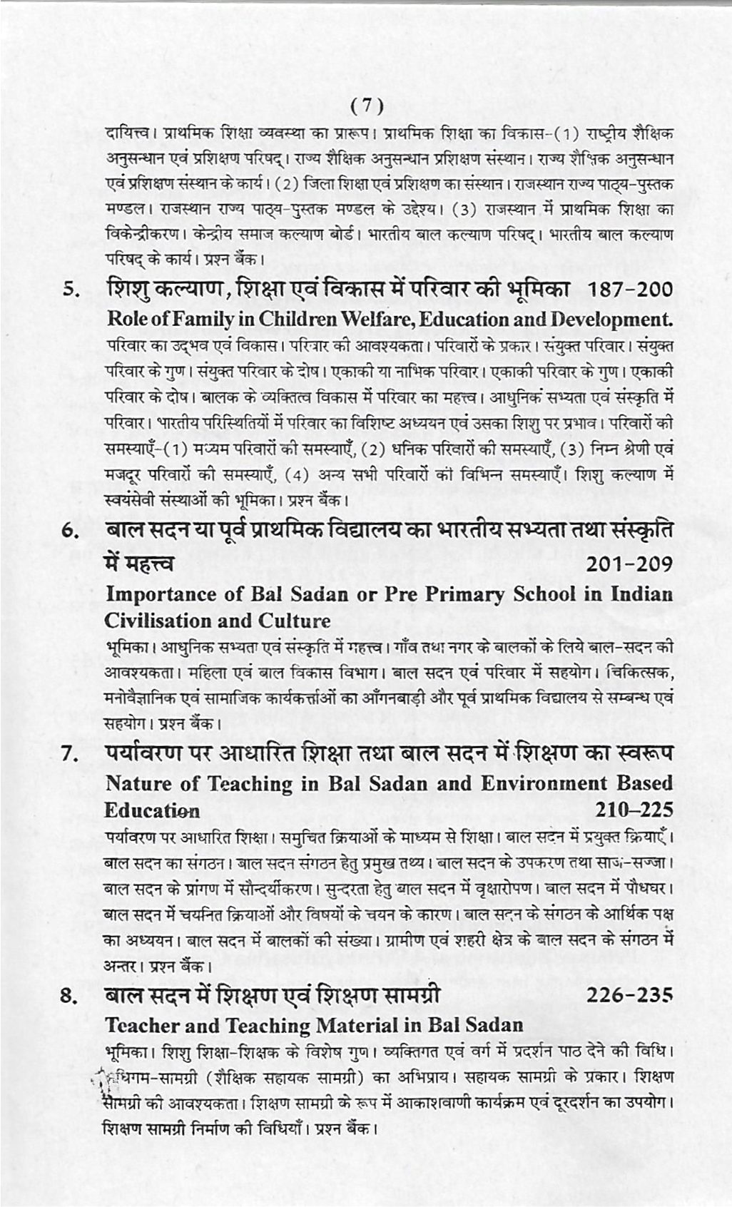6. बाल सदन या पूर्व प्राथमिक विद्यालय, आधुनिक सभ्यता और संस्कृति में इसका महत्त्व (भारतीय परिस्थितियों के विशेष सन्दर्भ में) गाँव और नगर के बालकों के लिये बाल सदन, बालकों का परिवार के साथ सह-सम्बन्ध, बाल सदन का परिवार के साथ सहयोग, डॉक्टर, सामाजिक कार्यकर्ता एवं अन्य बाल संगठन।