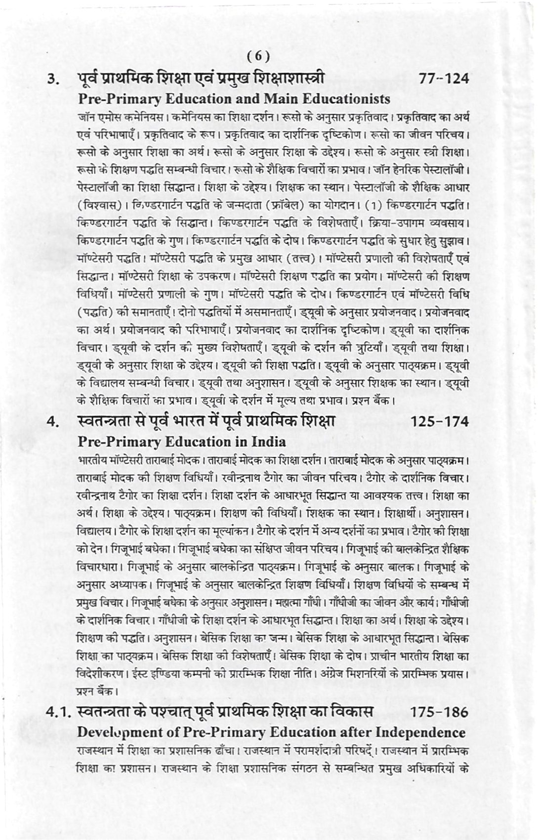 4.1 स्वतन्त्रता से पूर्व भरत में पूर्व प्राथमिक शिक्षा-आन्दोलन- (अ) ताराबाई मोदक। (ब) रवीन्द्रनाथ टैगोर। (स) गिजुभाई बधेका। (द) महात्मा गाँधी। (य) मिशनरीज का प्रभाव। 4.2 स्वतन्त्रता के पश्चात् भारत में पूर्व प्राथमिक शिक्षा- (अ) केन्द्रीय समाज कल्याण बोर्ड (सी.एस.