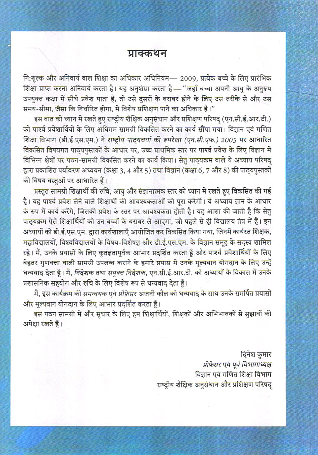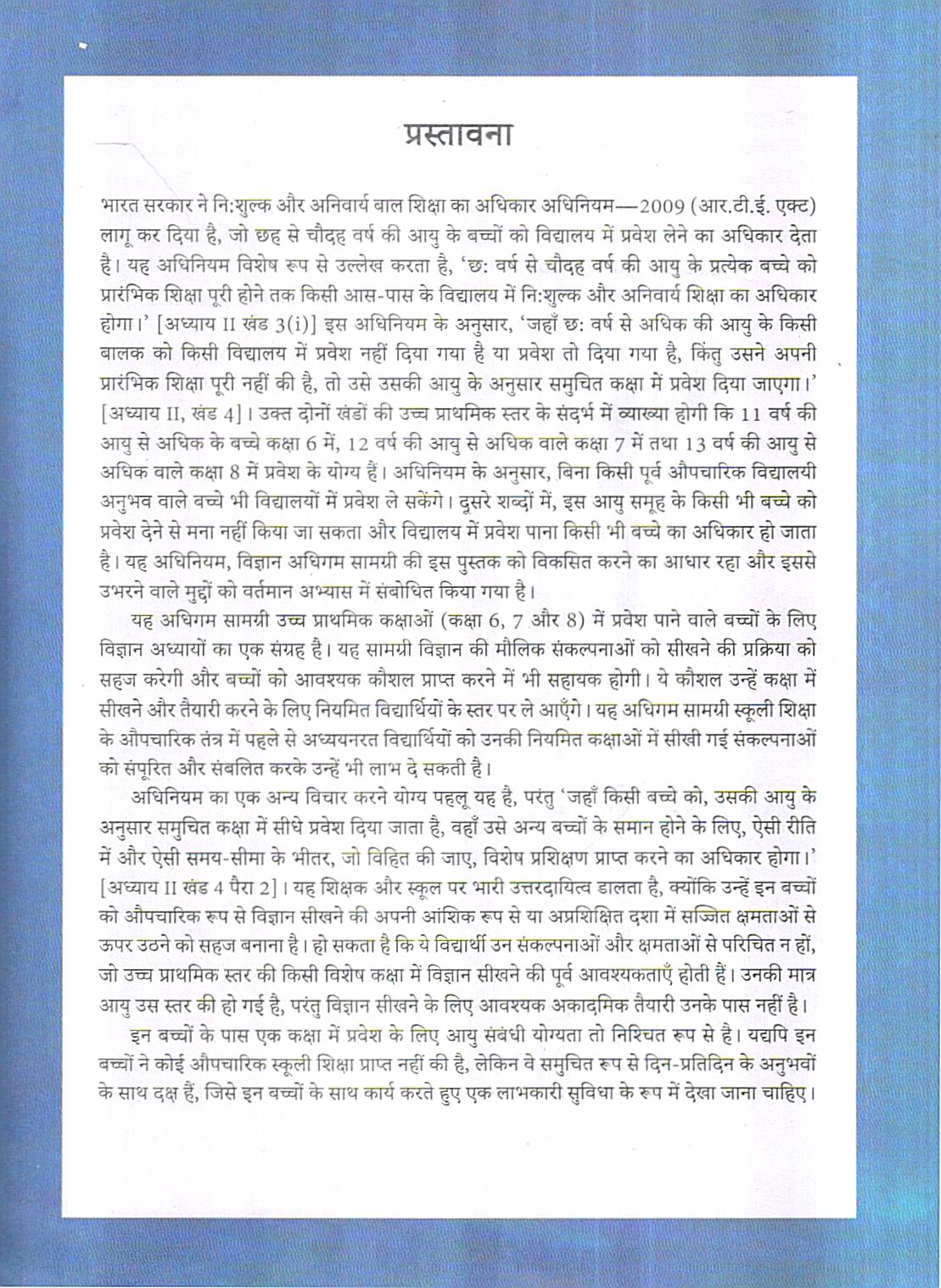 निःशुल्क और अनिवार्य बाल शिक्षा का अधिकार अधिनियम 2009 (आर.टी.ई. एक्ट) का उद्देश्य बड़ी संख्या में उन बच्चों का विद्यालय जाना सुनिश्चित करना है, जो या तो स्कूल नहीं जा सके हैं अचवा उन्होंने प्राथमिक शिक्षा प्राप्त किए बिना ही अनेक कारणों से विद्यालय छोड़ दिया है। विद्यालय न जाने वाले इन बच्चों को गुणवत्तापूर्ण शिक्षा प्रदान करना शिक्षकों और शिक्षक प्रशिक्षकों, दोनों के लिए एक चुनौतीपूर्ण कार्य है। ऐसे बच्चों की आवश्यकताओं की पूर्ति के लिए राष्ट्रीय शैक्षिक अनुसंधान और प्रशिक्षण परिषद् ने विज्ञान विषय में अधिगम सामग्री का विकास किया है। यह अधिगम सामग्री प्रासंगिक है और इसे सरल भाषा में चित्रों तथा उदाहरणों के साथ तैयार किया गया है, जिससे इन बच्चों में सीखने- समझने का विकास अन्य बच्चों की तरह हो सके।