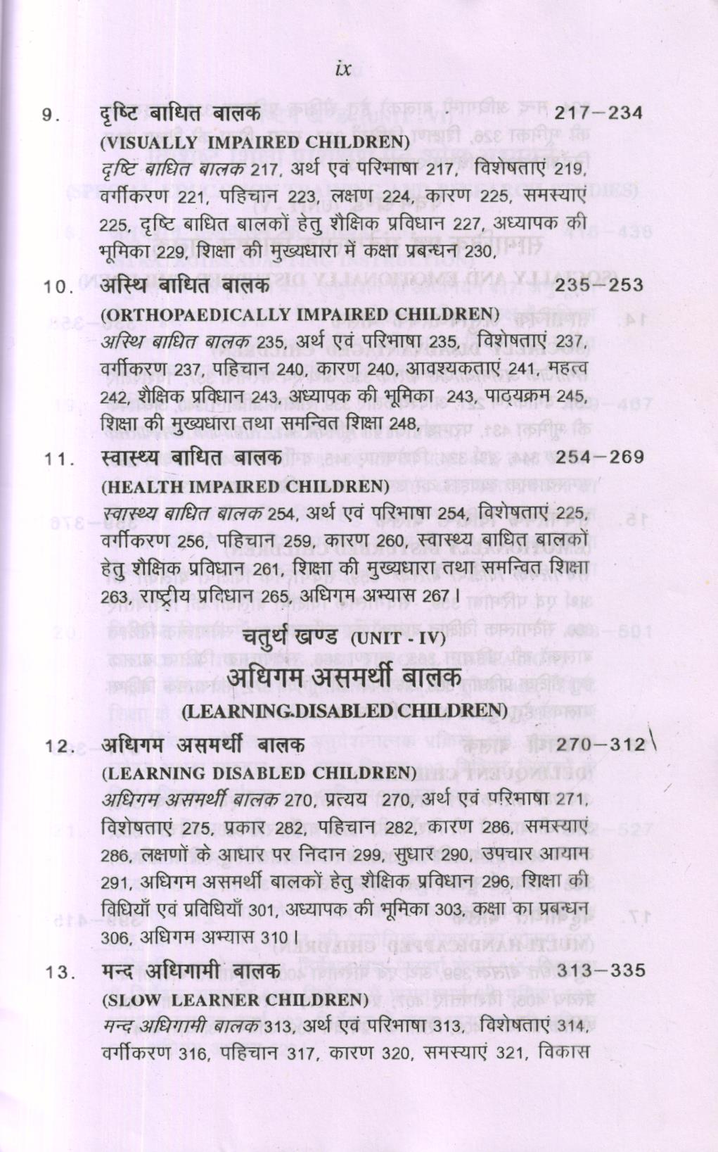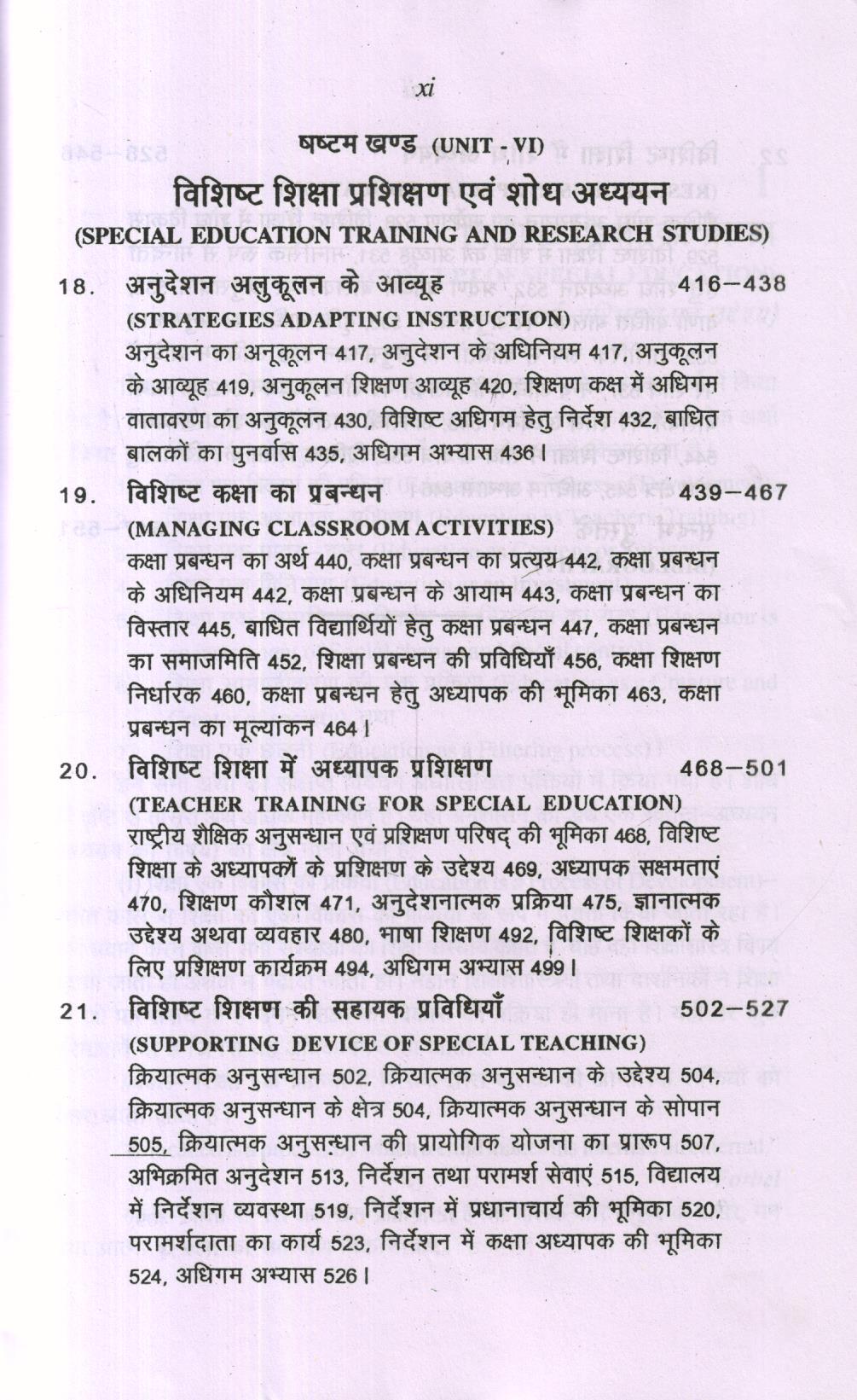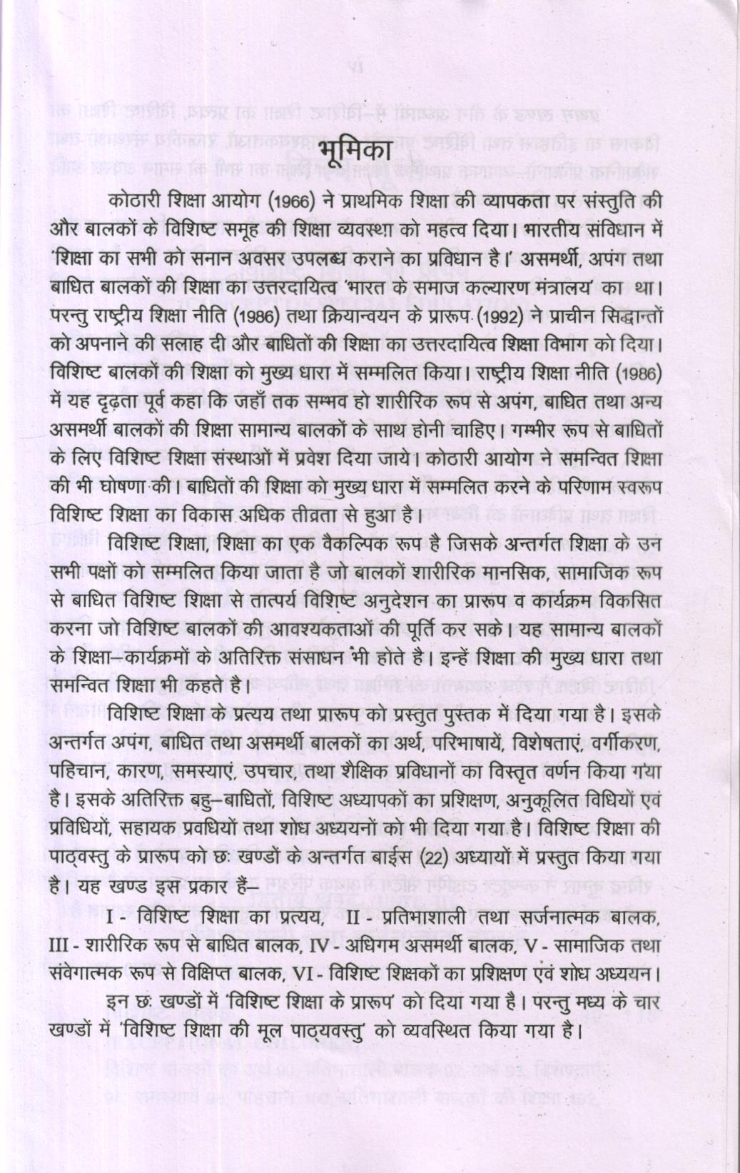 III – शारीरिक रूप से बाधित बालक, IV अधिगम असमर्थी बालक, V – सामाजिक तथा संवेगात्मक रूप से विक्षिप्त बालक, VI- विशिष्ट शिक्षकों का प्रशिक्षण एवं शोध अध्ययन । इन छः खण्डों में ‘विशिष्ट शिक्षा के प्रारूप को दिया गया है। परन्तु मध्य के चार खण्डों में ‘विशिष्ट शिक्षा की मूल पाठ्यवस्तु को व्यवस्थित किया गया है।