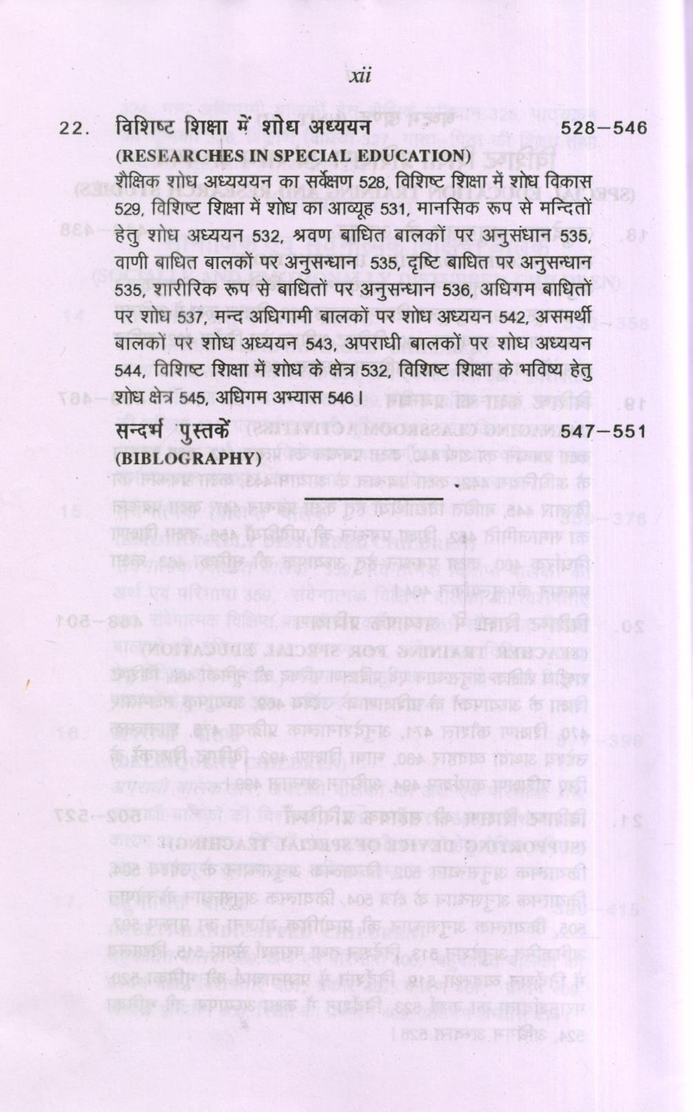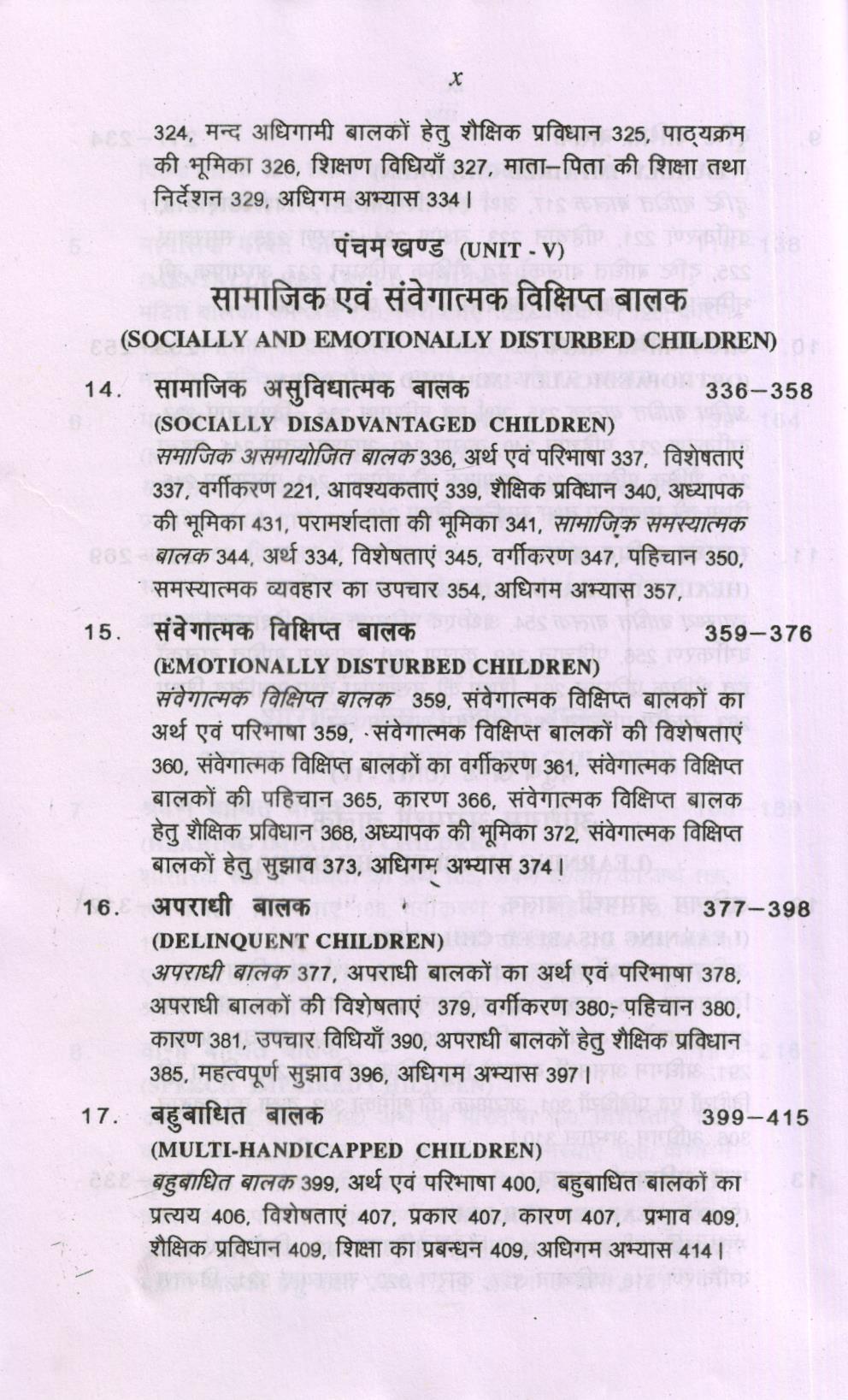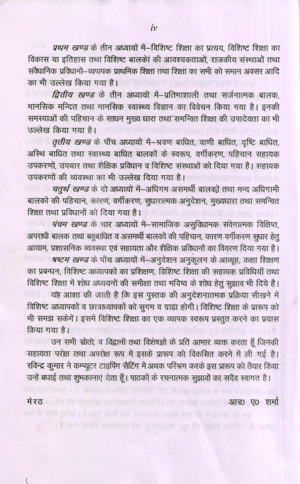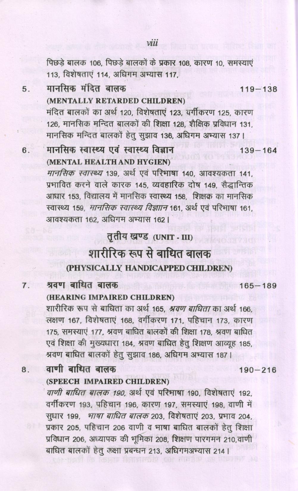 III – शारीरिक रूप से बाधित बालक, IV अधिगम असमर्थी बालक, V – सामाजिक तथा संवेगात्मक रूप से विक्षिप्त बालक, VI- विशिष्ट शिक्षकों का प्रशिक्षण एवं शोध अध्ययन । इन छः खण्डों में ‘विशिष्ट शिक्षा के प्रारूप को दिया गया है। परन्तु मध्य के चार खण्डों में ‘विशिष्ट शिक्षा की मूल पाठ्यवस्तु को व्यवस्थित किया गया है।