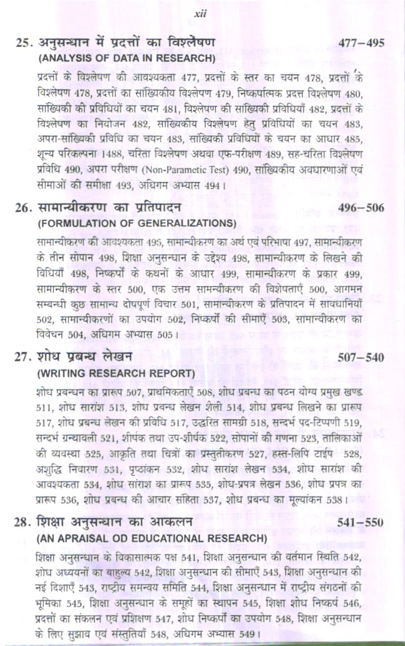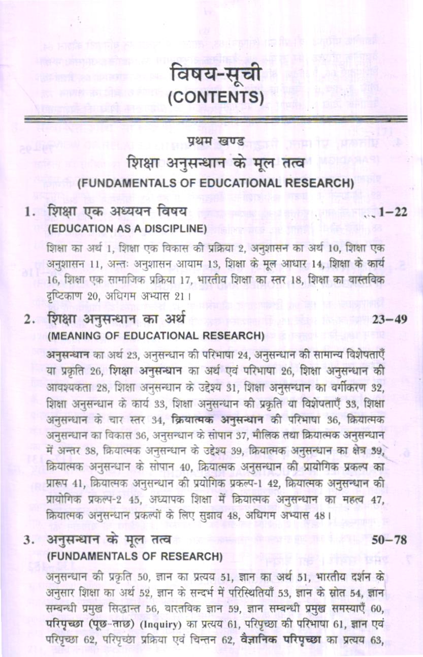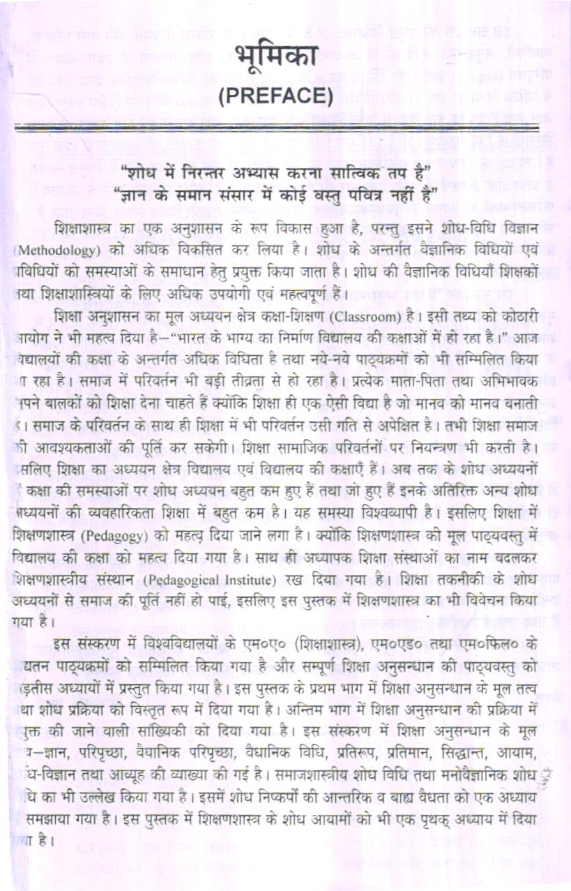 आयोग ने भी महत्व दिया है- “भारत के भाग्य का निर्माण विद्यालय की कक्षाओं में हो रहा है।” आज वेद्यालयों की कक्षा के अन्तर्गत अधिक विधिता है तथा नये-नये पाठ्यक्रमों को भी सम्मिलित किया ॥ रहा है। समाज में परिवर्तन भी बड़ी तीव्रता से हो रहा है। प्रत्येक माता-पिता तथा अभिभावक अपने बालकों को शिक्षा देना चाहते हैं क्योंकि शिक्षा ही एक ऐसी विद्या है जो मानव को मानव बनाती है। समाज के परिवर्तन के साथ ही शिक्षा में भी परिवर्तन उसी गति से अपेक्षित है। तभी शिक्षा समाज की आवश्यकताओं की पूर्ति कर सकेगी। शिक्षा सामाजिक परिवर्तनों पर नियन्त्रण भी करती है। सलिए शिक्षा का अध्ययन क्षेत्र विद्यालय एवं विद्यालय की कक्षाएँ हैं। अब तक के शोध अध्ययनों * कक्षा की समस्याओं पर शोध अध्ययन बहुत कम हुए हैं तथा जो हुए हैं इनके अतिरिक्त अन्य शोध अध्ययनों की व्यवहारिकता शिक्षा में बहुत कम है। यह समस्या विश्वव्यापी है। इसलिए शिक्षा में शिक्षणशास्त्र (Pedagogy) को महत्व दिया जाने लगा है। क्योंकि शिक्षणशास्त्र की मूल पाठ्यवस्तु में विद्यालय की कक्षा को महत्व दइस संस्करण में विश्वविद्यालयों के एम०ए० (शिक्षाशास्त्र), एम०एड० तथा एम० फिल० के यतन पाठ्यक्रमों को सम्मिलित किया गया है और सम्पूर्ण शिक्षा अनुसन्धान की पाठ्यवस्तु को ड़तीस अध्यायों में प्रस्तुत किया गया है। इस पुस्तक के प्रथम भाग में शिक्षा अनुसन्धान के मूल तत्व था शोध प्रक्रिया को विस्तृत रूप में दिया गया है। अन्तिम भाग में शिक्षा अनुसन्धान की प्रक्रिया में युक्त की जाने वाली सांख्यिकी को दिया गया है। इस संस्करण में शिक्षा अनुसन्धान के मूल व-ज्ञान, परिपृच्छा, वैधानिक परिपृच्छा, वैधानिक विधि, प्रतिरूप, प्रतिमान, सिद्धान्त, आयाम, घ-विज्ञान तथा आव्यूह की व्याख्या की गई है। समाजशास्त्रीय शोध विधि तथा मनोवैज्ञानिक शोध धि का भी उल्लेख किया गया है। इसमें शोध निष्कर्षों की आन्तरिक व बाह्य वैधता को एक अध्याय समझाया गया है। इस पुस्तक में शिक्षणशास्त्र के शोध आयामों को भी एक पृथक् अध्याय में दिया या है।
