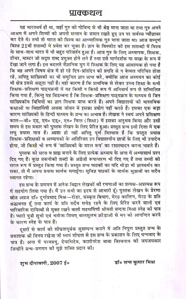 यह भारतवर्ष ही था, जहाँ गुरु की गोविन्द से भी श्रेष्ठ माना जाता था तथा गुरु अपने आश्रम में अपने शिष्यों को अपनी सन्तान के समान रखते हुए उन पर सर्वस्व न्यौछावर कर देते थे। तभी तो भारत को विश्व का आध्यात्मिक गुरु माना जाता था। आज सम्पूर्ण विश्व 21वीं शताब्दी में प्रवेश कर चुका है। ज्ञान के विस्फोट की इस शताब्दी में विश्व के साथ-साथ भारत में भी बहुत परिवर्तन हुआ है। आज गुरु के लिए अध्यापक, शिक्षक, टीचर, मास्टर जी सदृश शब्द प्रयुक्त होने लगे हैं तथा उसे मार्गदर्शक या सखा के रूप में देखा जाने लगा है। इस बदलते वैज्ञानिक युग में शिक्षक के लिए यह आवश्यक हो गया है कि वह अपने विषय क्षेत्र में हो रहे दिन-प्रतिदिन की प्रगति से न केवल परिचित होता रहे, अपितु सांख्यिकी का भी समुचित ज्ञान प्राप्त करे, क्योंकि आज अध्ययन का कोई भी क्षेत्र इससे अछूता नहीं है। यही कारण है कि प्राथमिक से लेकर उच्च शिक्षा के सभी शिक्षक-प्रशिक्षण पाठ्यक्रमों में यह किसी न किसी रूप में अनिवार्य रूप से सम्मिलित किया गया है, किन्तु यह विडम्बना है कि शिक्षक प्रशिक्षण पाठ्यक्रम के माध्यम से जिन सांख्यिकीय विधियों का ज्ञान शिक्षक प्राप्त करते हैं। अपने विद्यालयों की वास्तविक कक्षाओं या विद्यार्थियों अथवा जीवन में इसका प्रयोग नहीं करते हैं। इसका एक बड़ा कारण सांख्यिकी के हिन्दी माध्यम के ग्रन्थ का अभाव है। लेखक ने स्वयं अपने प्रशिक्षण काल-बी० एड, एम० ए०, एम० फिल (शिक्षा) में इसका अनुभव किया और उसी समय से इस प्रकार की पुस्तक लेखन के लिए प्रेरित हुआ। प्रस्तुत ग्रन्थ इसी दिशा में एक लघु प्रयास मात्र है। आशा ही नहीं अपितु पूर्ण विश्वास है कि प्रस्तुत प्रयास शिक्षक-प्रशिक्षकों व अध्यापकों के अतिरिक्त उन विद्यालयीय छात्रों के लिए भी उपादेय होगा, जो किसी भी रूप में ‘सांख्यिकी के सरल रूप’ का रसास्वादन करना चाहते हैं।