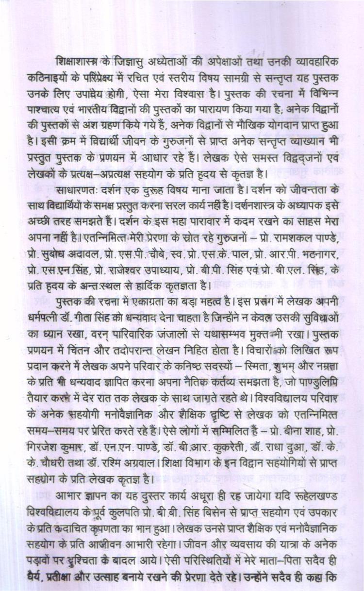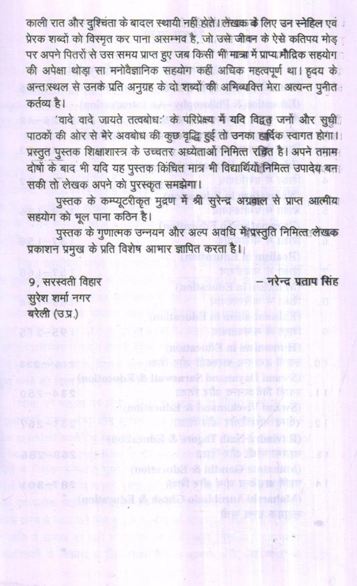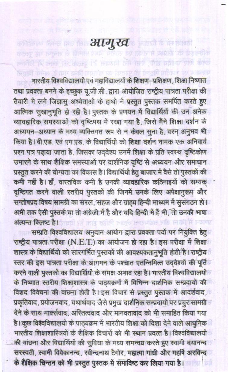 भारतीय विश्वविद्यालयों एवं महाविद्यालयों के शिक्षण-प्रशिक्षण, शिक्षा निष्णात तथा प्रवक्ता बनने के इच्छुक यू.जी.सी. द्वारा आयोजित राष्ट्रीय पात्रता परीक्षा की तैयारी में लगे जिज्ञासु अध्येताओं के हाथों में प्रस्तुत पुस्तक समर्पित करते हुए आत्मिक सुखानुभूति हो रही है। पुस्तक के प्रणयन में विद्यार्थियों की उन अनेक व्यावहारिक समस्याओं को दृष्टिपथ में रखा गया है, जिसे मैंने शिक्षा दर्शन के अध्ययन-अध्यान के मध्य व्यक्तिगत रूप से न केवल सुना है, वरन् अनुभव भी किया है। बी.एड. एवं एम.एड. के विद्यार्थियों को शिक्षा दर्शन नामक एक अनिवार्य प्रश्न पत्र पढ़ाया जाता है, जिसका उद्देश्य उनमें शिक्षा के प्रति स्वस्थ दृष्टिकोण उभारने के साथ शैक्षिक समस्याओं पर दार्शनिक दृष्टि से अध्ययन और समाधान प्रस्तुत करने की योग्यता का विकास है। विद्यार्थियों हेतु बाजार में वैसे तो पुस्तकों की कमी नहीं है। हाँ, वास्तविक कमी है उनकी व्यावहारिक कठिनाइयों को सम्यक् दृष्टिगत करने वाली स्तरीय पुस्तकों की जिनमें उनके लिए अपेक्षानुरूप और सन्तोषप्रद विषय सामग्री का सरल, सहज और ग्राह्य हिन्दी माध्यम में सुसंगठन हो। अभी तक ऐसी पुस्तकें या तो अंग्रेजी में हैं और यदि हिन्दी में हैं भी, तो उनकी भाषा अंत्यन्त क्लिष्ट है।
