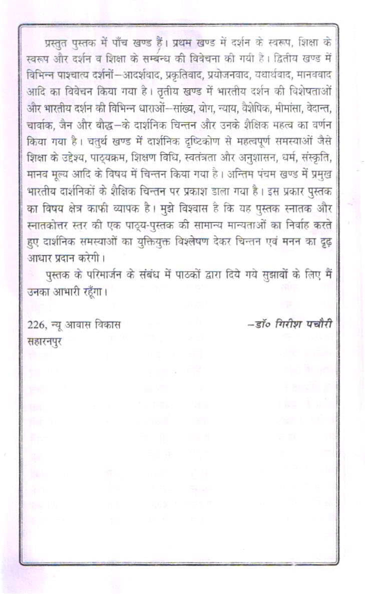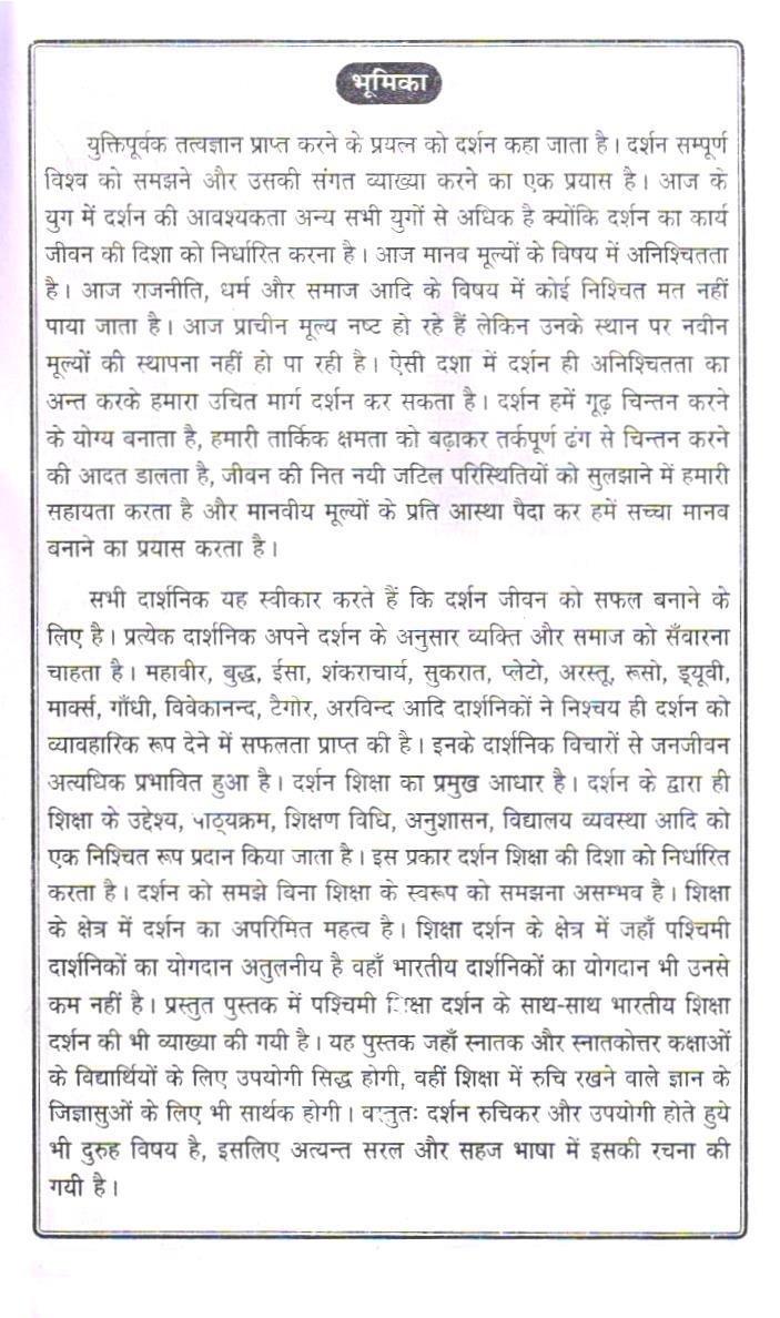 सभी दार्शनिक यह स्वीकार करते हैं कि दर्शन जीवन को सफल बनाने के लिए है। प्रत्येक दार्शनिक अपने दर्शन के अनुसार व्यक्ति और समाज को सँवारना चाहता है। महावीर, बुद्ध, ईसा, शंकराचार्य, सुकरात, प्लेटो, अरस्तू, रूसो, ड्यूवी, मार्क्स, गाँधी, विवेकानन्द, टैगोर, अरविन्द आदि दार्शनिकों ने निश्चय ही दर्शन को व्यावहारिक रूप देने में सफलता प्राप्त की है। इनके दार्शनिक विचारों से जनजीवन अत्यधिक प्रभावित हुआ है। दर्शन शिक्षा का प्रमुख आधार है। दर्शन के द्वारा ही शिक्षा के उद्देश्य, पाठ्यक्रम, शिक्षण विधि, अनुशासन, विद्यालय व्यवस्था आदि को एक निश्चित रूप प्रदान किया जाता है। इस प्रकार दर्शन शिक्षा की दिशा को निर्धारित करता है। दर्शन को समझे बिना शिक्षा के स्वरूप को समझना असम्भव है। शिक्षा के क्षेत्र में दर्शन का अपरिमित महत्व है। शिक्षा दर्शन के क्षेत्र में जहाँ पश्चिमी दार्शनिकों का योगदान अतुलनीय है वहाँ भारतीय दार्शनिकों का योगदान भी उनसे कम नहीं है। प्रस्तुत पुस्तक में पश्चिमी शिक्षा दर्शन के साथ-साथ भारतीय शिक्षा दर्शन की भी व्याख्या की गयी है। यह पुस्तक जहाँ स्नातक और स्नातकोत्तर कक्षाओं के विद्यार्थियों के लिए उपयोगी सिद्ध होगी, वहीं शिक्षा में रुचि रखने वाले ज्ञान के जिज्ञासुओं के लिए भी सार्थक होगी। वस्तुतः दर्शन रुचिकर और उपयोगी होते हुये भी दुरुह विषय है, इसलिए अत्यन्त सरल और सहज भाषा में इसकी रचना की गयी है।