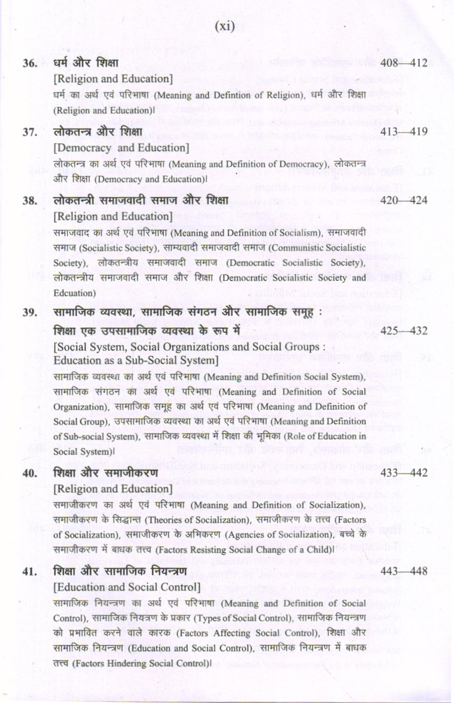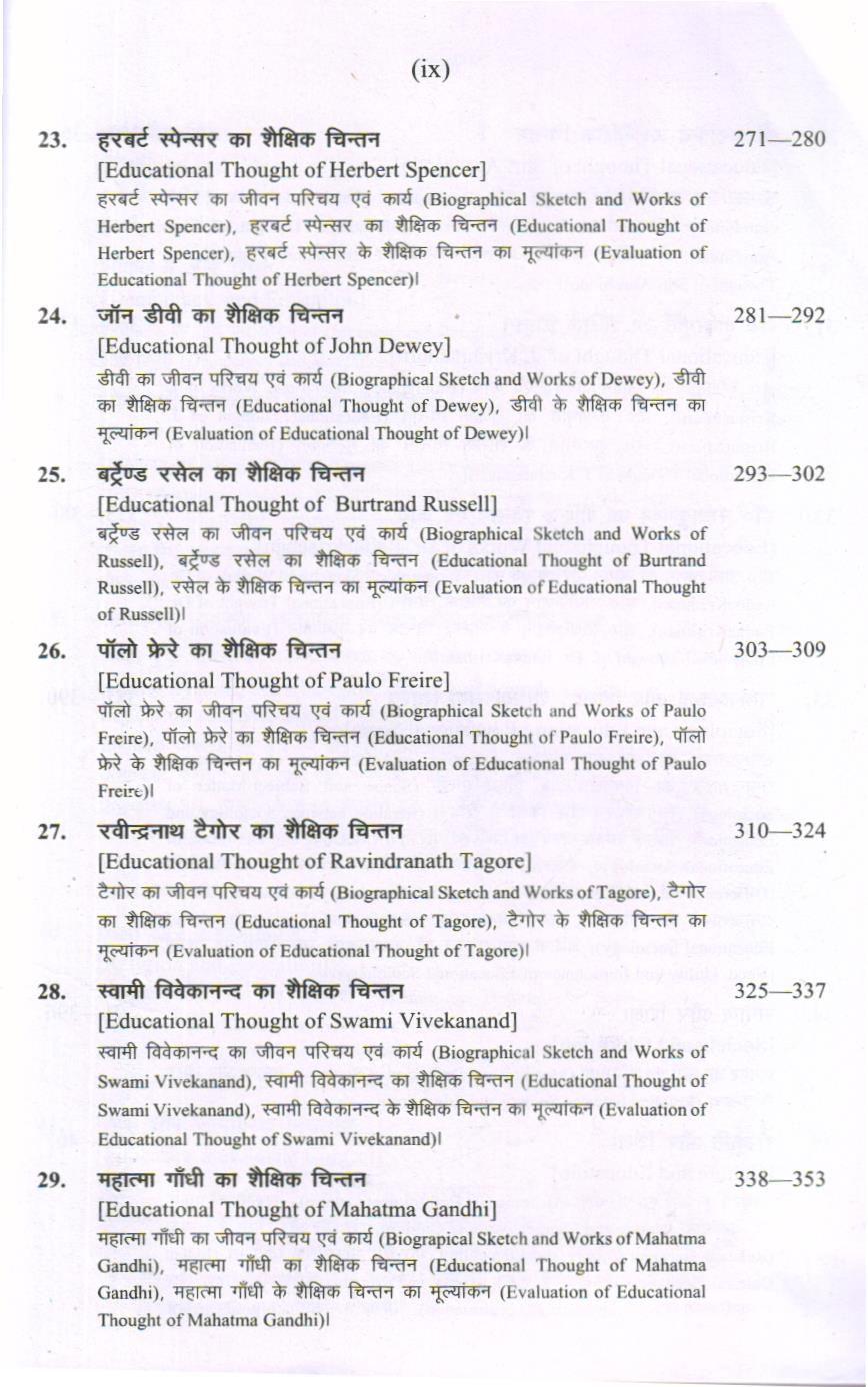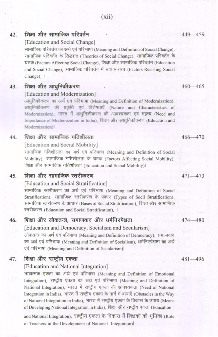 चिन्तन के साथ-साथ पाश्चात्य चिन्तकों के शैक्षिक चिन्तन से भी परिचित कराया, अतः पाँचवे पायदान पर पाश्चात्य चिन्तकों के शैक्षिक चिन्तन पर प्रकाश डाला गया है। अंग्रेजों के शासनकाल में भारत में जन चेतना जागृत हुई, हमारे देश के चिन्तकों ने भी भारतीय शिक्षा के स्वरूप पर चिन्तन करना शुरू किया, अतः छटे सोपान पर भारतीय चिन्तकों के शैक्षिक चिन्तन पर प्रकाश डाला गया है। इसके बाद सातवें सोपान पर शैक्षिक समाजशास्त्र के स्वरूप पर प्रकाश डाला गया है, आठवें सोपान पर समाज के विभिन्न पक्षों के शिक्षा पर प्रभाव पर प्रकाश डाला गया है, नवें सोपान पर शिक्षा के समाज के विभिन्न पक्षों पर प्रभाव पर पकाश डाला गया है, दशवें सोपान पर शिक्षा के विभिन्न अभिकरणों की भूमिका स्पष्ट की गई है और ग्यारहवें एवं अन्तिम सोपान पर शेष सभी असम्बद्ध, प्रकणों पर प्रकाश डाला गया है