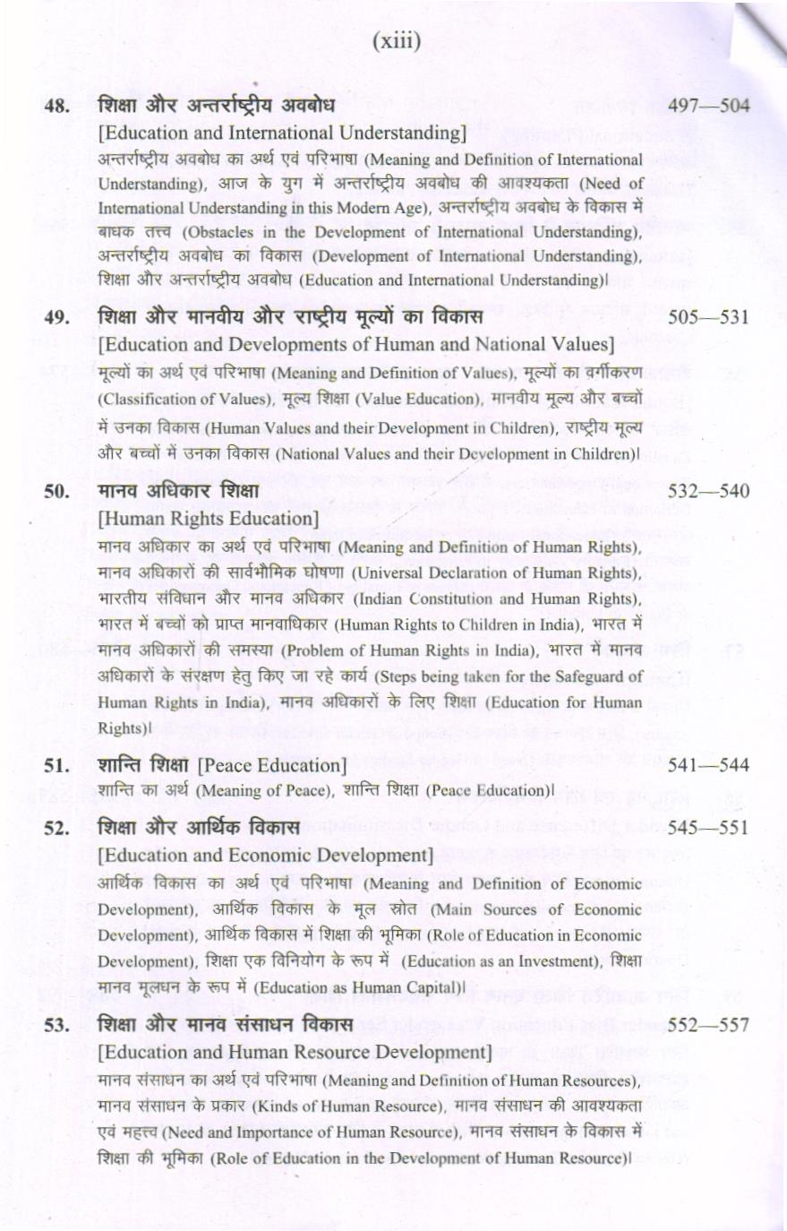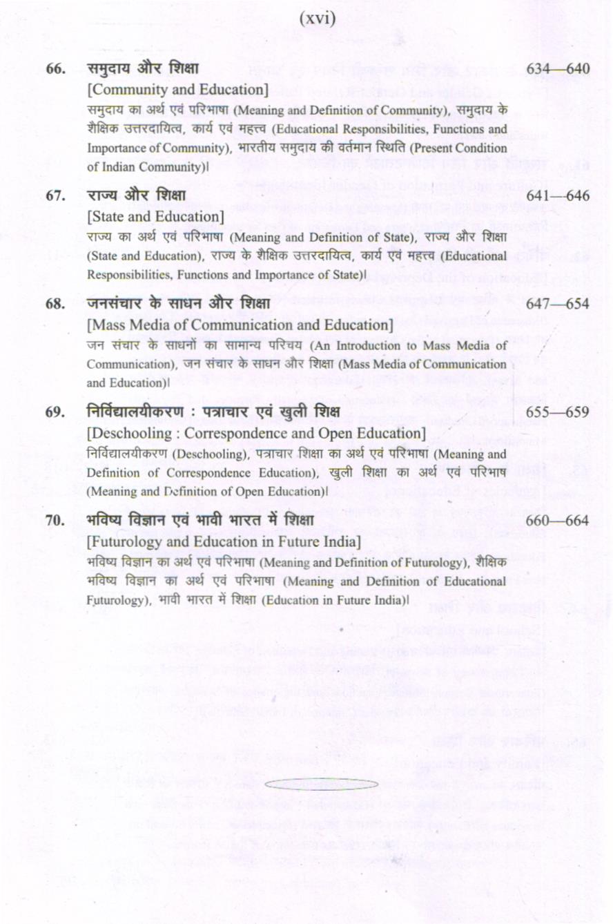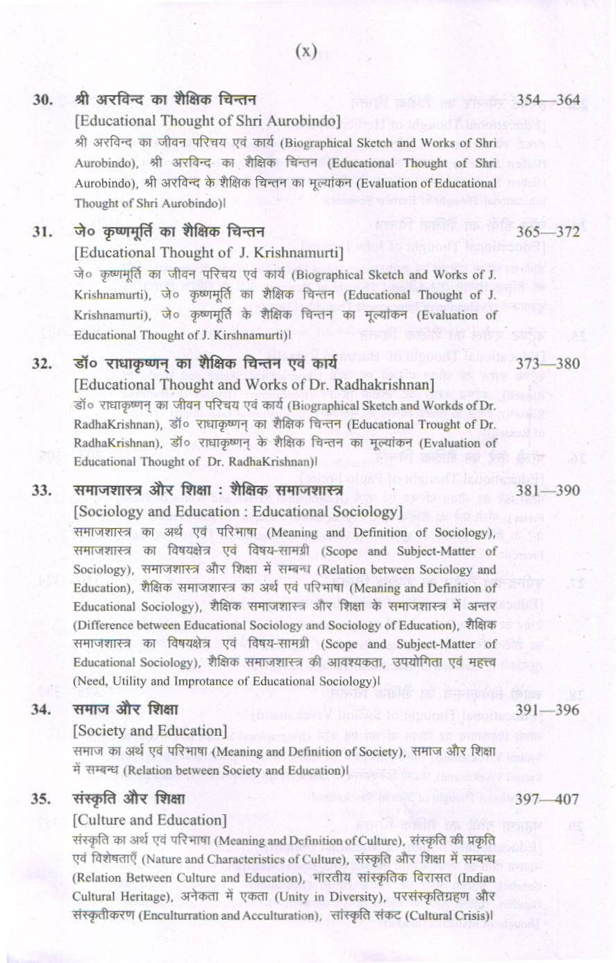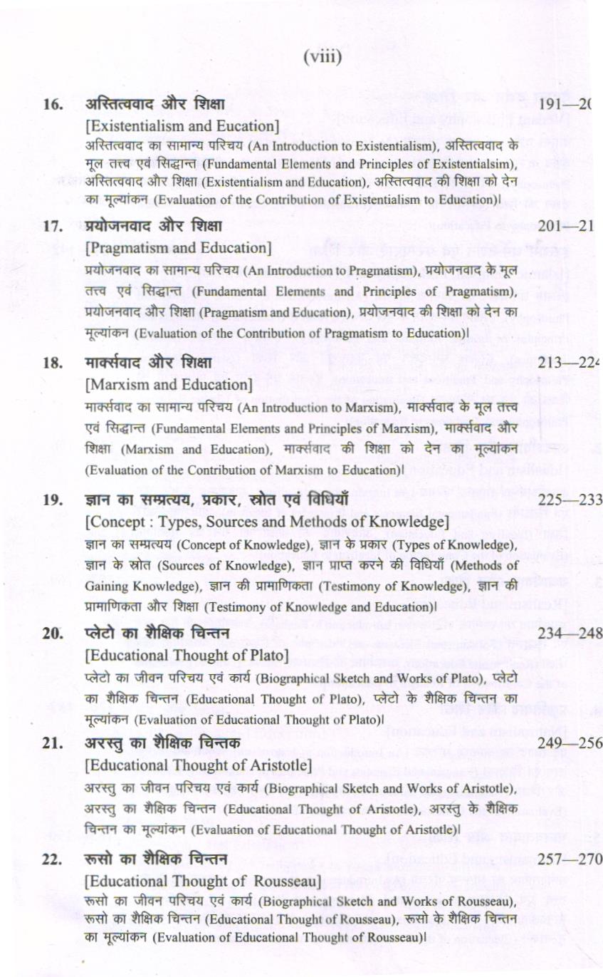 चिन्तन के साथ-साथ पाश्चात्य चिन्तकों के शैक्षिक चिन्तन से भी परिचित कराया, अतः पाँचवे पायदान पर पाश्चात्य चिन्तकों के शैक्षिक चिन्तन पर प्रकाश डाला गया है। अंग्रेजों के शासनकाल में भारत में जन चेतना जागृत हुई, हमारे देश के चिन्तकों ने भी भारतीय शिक्षा के स्वरूप पर चिन्तन करना शुरू किया, अतः छटे सोपान पर भारतीय चिन्तकों के शैक्षिक चिन्तन पर प्रकाश डाला गया है। इसके बाद सातवें सोपान पर शैक्षिक समाजशास्त्र के स्वरूप पर प्रकाश डाला गया है, आठवें सोपान पर समाज के विभिन्न पक्षों के शिक्षा पर प्रभाव पर प्रकाश डाला गया है, नवें सोपान पर शिक्षा के समाज के विभिन्न पक्षों पर प्रभाव पर पकाश डाला गया है, दशवें सोपान पर शिक्षा के विभिन्न अभिकरणों की भूमिका स्पष्ट की गई है और ग्यारहवें एवं अन्तिम सोपान पर शेष सभी असम्बद्ध, प्रकणों पर प्रकाश डाला गया है