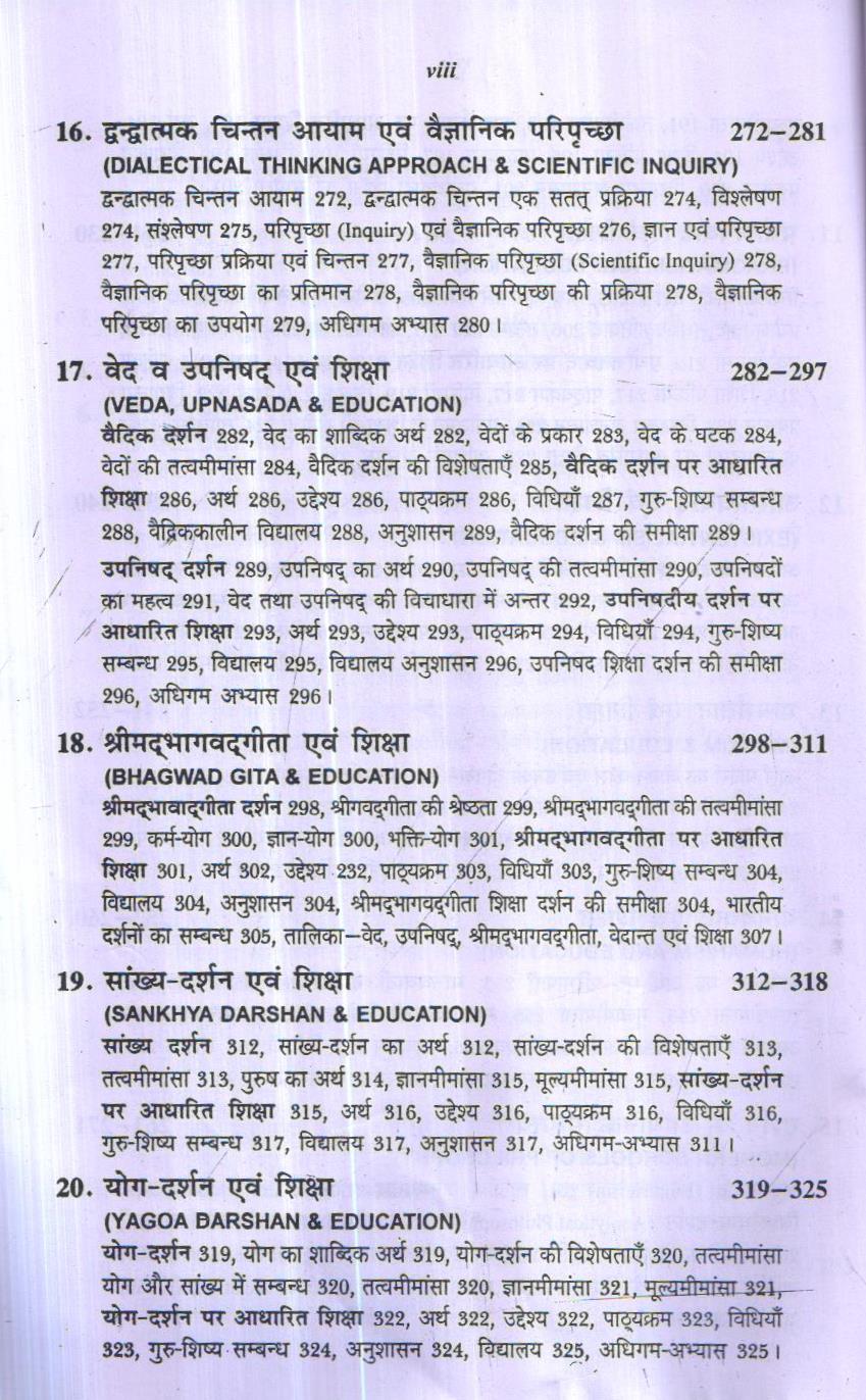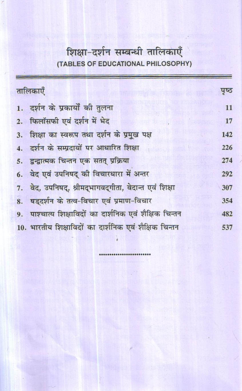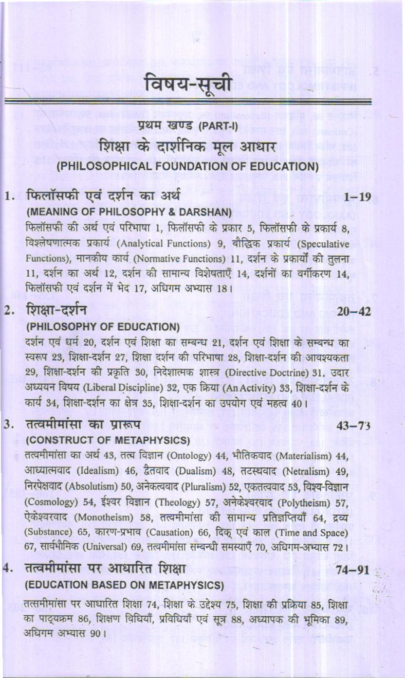दर्शन के मूल तत्व चार माने जाते हैं-तत्वमीमांसा, ज्ञानमीमांसा, मूल्यमीमांसा एवं तर्कमीमांसा। इन्हीं से किसी दर्शन के सम्प्रदाय के प्रारूप का बोध होता है। इस पुस्तक में इन तत्वों का वर्णन विस्तार से किया गया है तथा इन तत्वों का शिक्षा में योगदान को भी स्पष्ट किया गया है। इन तत्वों के तन्दर्भ में दर्शनों की तुलना भी की गई है। जिससे दर्शनों की भित्रता का बोध होता है। विद्वानों के दार्शनिक चिन्तन एवं उनका शिक्षा में योगदान का वर्णन भी किया गया है।