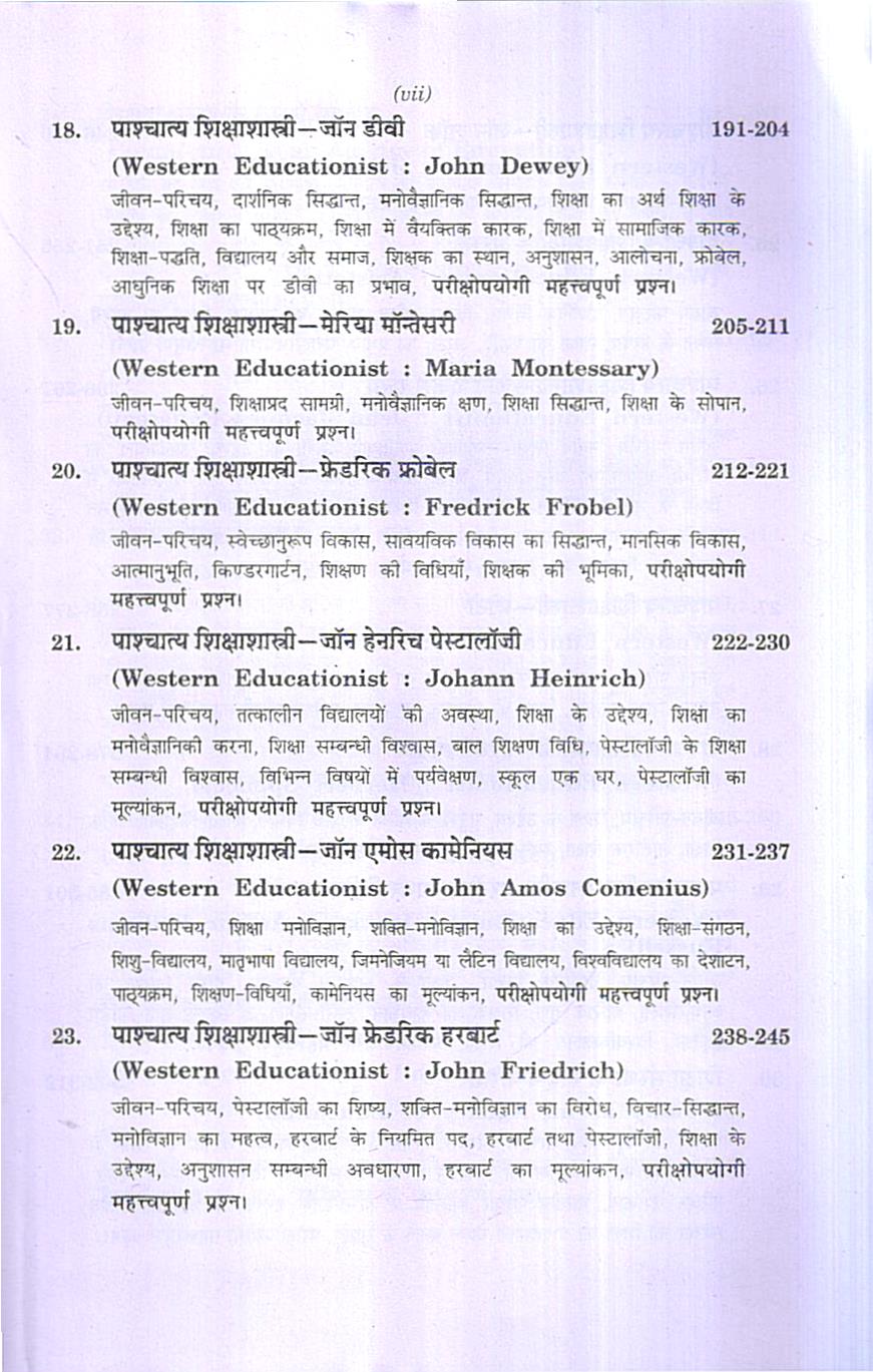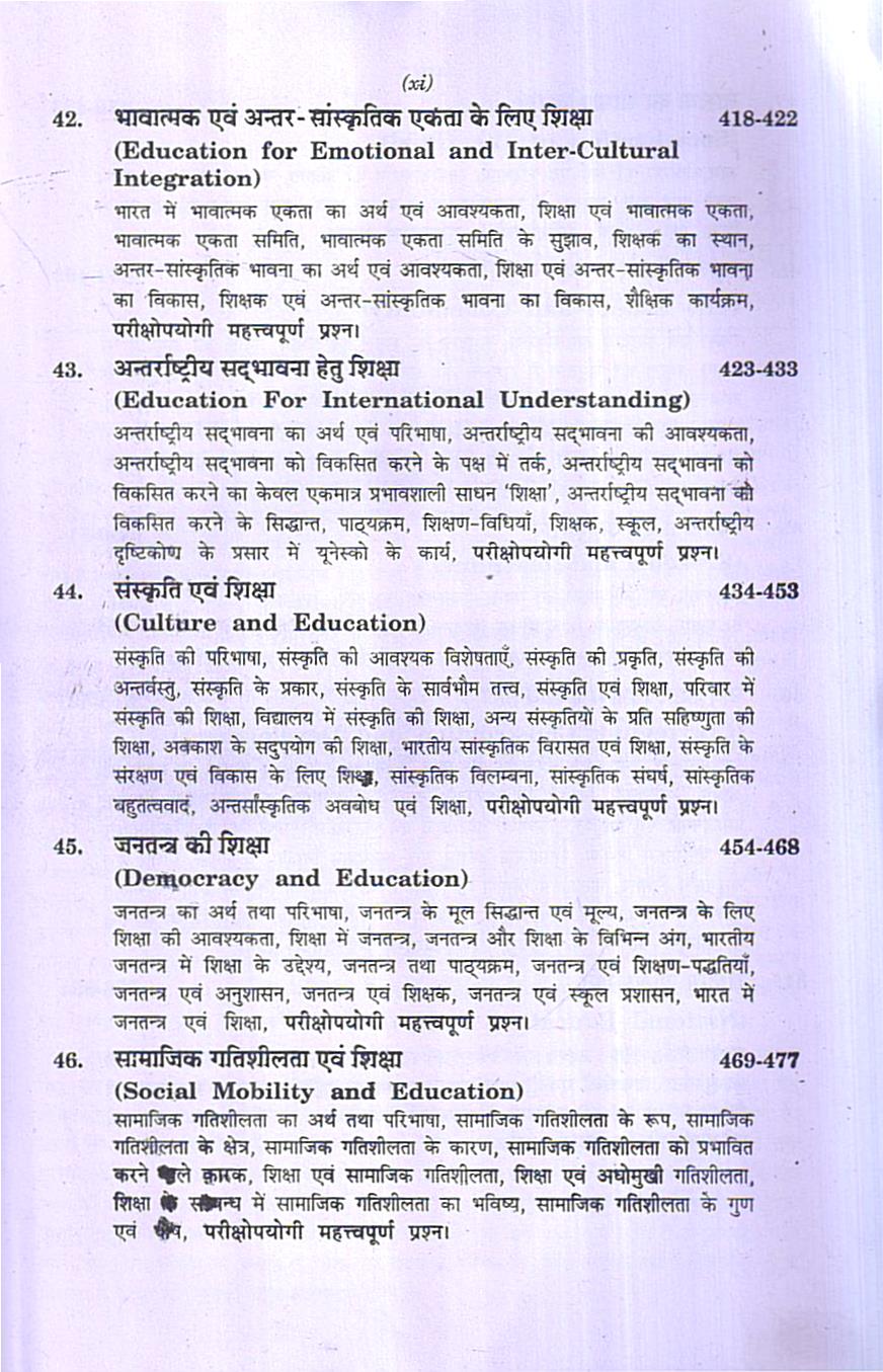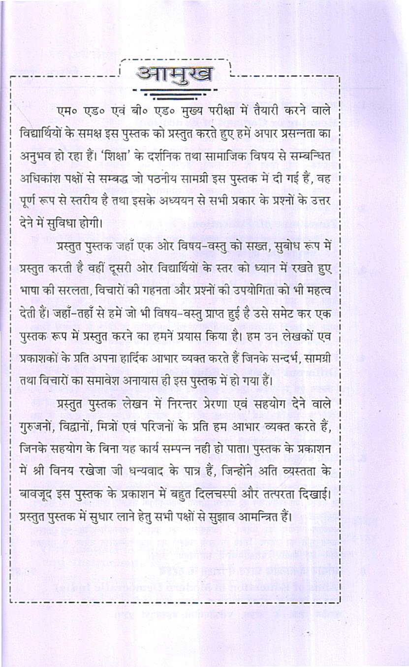 एम० एड० एवं बी० एड० मुख्य परीक्षा में तैयारी करने वाले विद्यार्थियों के समक्ष इस पुस्तक को प्रस्तुत करते हुए हमें अपार प्रसन्नता का अनुभव हो रहा हैं। ‘शिक्षा’ के दर्शनिक तथा सामाजिक विषय से सम्बन्धित अधिकांश पक्षों से सम्बद्ध जो पठनीय सामग्री इस पुस्तक में दी गई हैं, वह | पूर्ण रूप से स्तरीय है तथा इसके अध्ययन से सभी प्रकार के प्रश्नों के उत्तर ! देने में सुविधा होगी।