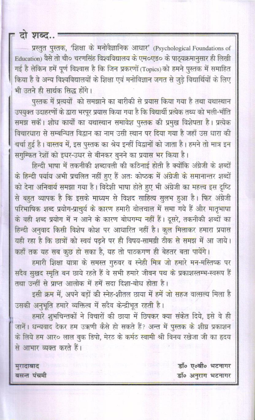 प्रस्तुत पुस्तक, ‘शिक्षा के मनोवैज्ञानिक आधार’ (Psychological Foundations of Education) वैसे तो चौ० चरणसिंह विश्वविद्यालय के एम०एड० के पाठ्यक्रमानुसार ही लिखी गई है लेकिन हमें पूर्ण विश्वास है कि जिन प्रकरणों (Topics) को हमने पुस्तक में समाहित किया है वे अन्य विश्वविद्यालयों के शिक्षा एवं मनोविज्ञान जगत से जुड़े विद्यार्थियों के लिए भी उतने ही सार्थक सिद्ध होंगे।
