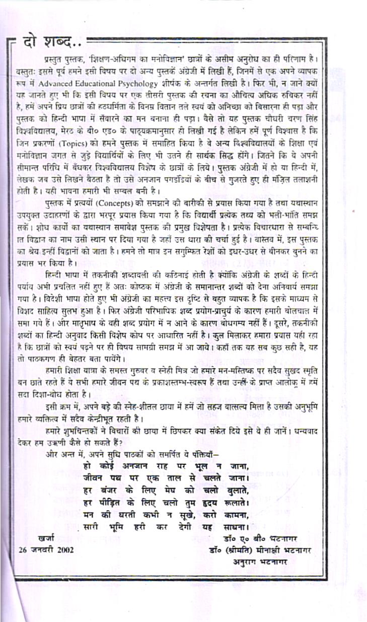 प्रस्तुत पुस्तक, ‘शिक्षण अधिगम का मनोविज्ञान’ छात्रों के असीम अनुरोध का ही परिणाम है। वस्तुतः इससे पूर्व हमने इसी विषय पर दो अन्य पुस्तकें अंग्रेजी में लिखी हैं, जिनमें से एक अपने व्यापक रूप में Advanced Educational Psychology शीर्षक के अन्तर्गत लिखी है। फिर भी, न जाने क्यों यह जानते हुए भी कि इसी विषय पर एक तीसरी पुस्तक की रचना का औचित्य अधिक रुचिकर नहीं है, हमें अपने प्रिय छात्रों की हठधर्मिता के विनम्र वितान तले स्वयं को अनिच्छा को बिसारना ही पड़ा और पुस्तक को हिन्दी भाषा में सँवारने का मन बनाना ही पड़ा। वैसे तो यह पुस्तक चौधरी चरण सिंह विश्वविद्यालय, मेरठ के बी० एड० के पाठ्यक्रमानुसार ही लिखी गई है लेकिन हमें पूर्ण विश्वास है कि जिन प्रकरणों (Topics) को हमने पुस्तक में समाहित किया है वे अन्य विश्वविद्यालयों के शिक्षा एवं मनोविज्ञान जगत से जुड़े विद्यार्थियों के लिए भी उतने ही सार्थक सिद्ध होंगे। जितने कि वे अपनी सीमान्त परिधि में बँधकर विश्वविद्यालय विशेष के छात्रों के लिये। पुस्तक अंग्रेजी में हो या हिन्दी में, लेखक जब उसे लिखने बैठता है तो उसे अनजान पगडंडियों के बीच से गुजरते हुए ही मंज़िल तलाशनी होती है। यही भावना हमारी भी सम्बल बनी है।