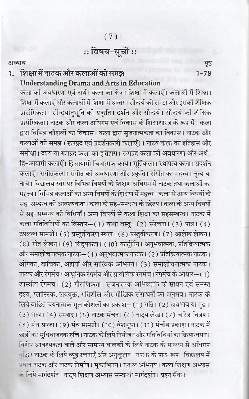 शिक्षा में कला एवं नाटक विषय के पाठ्यक्रम के अनुरूप सभी बिन्दुओं की विश्लेषणात्मक एवं रुचिपूर्ण व्याख्या की है। आशा है अध्ययन सामग्री प्राध्यापकों के अध्यापन तथा छात्राध्या