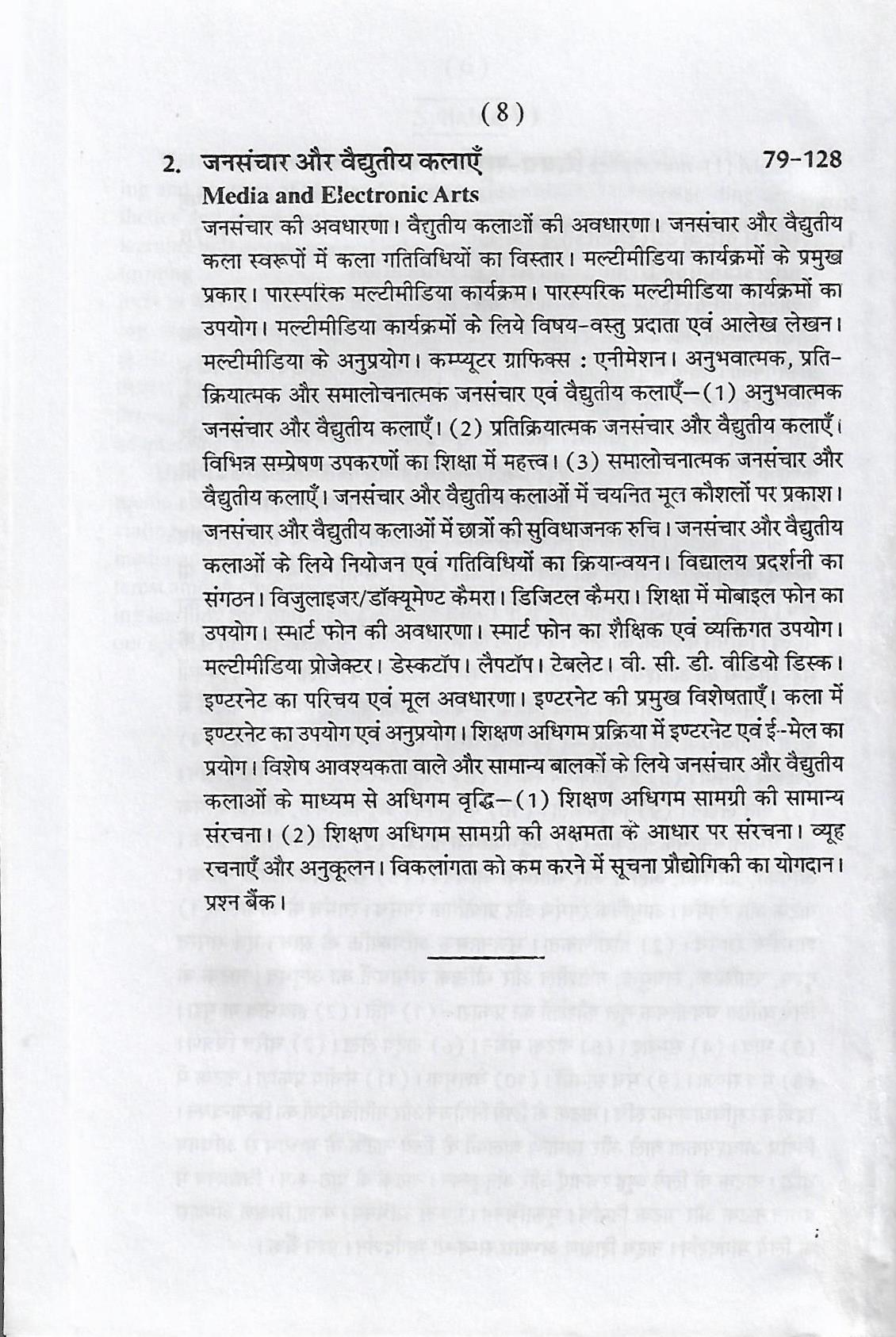 है। इसी कारण कसा शिवम् सुन्दरम् कीरक अधिि भी है। भरतमुनि कला को जान शिल्प और विद्या से भी मानते हैं। उनके द्वारा बी कराओं और बधी उरकका किया गया है। इस प्रकार चौकाओं की मान्यता विद्याभान है। करण के विविध रूप पथा- चित्रकला, नाटक, नृत्य, संगीत एवं हस्तशिल्प है। करता के महत्व के सन्दर्भ में जब हम चर्चा करते हैं तो हमारा ध्यान अदीत की परछाइयों में कला सन्दर्भ ढूँढने लगा है। भारतीय ग्रन्थों में इसका लेख मिलता है। सरस्वती की वीणा की झंकार से भला कौन मन्त्रमुग्ध नहीं हो जाता, नृत्य का दृश्य किसकी थकान दूर नहीं करता, नृत्य और नाटक की कला भला किसको नहीं भाती ? इसीलिये नृत्य, संगीत एवं चित्रांकन तीनों मिलकर आनन्द की असीम अनुभूति के परिचायक है। कला के अपरिमित महत्त्व के कारण भगवान श्रीकृष्ण की रासलीलाएँ आज भी सम्पूर्ण भारत में लोकप्रिय है। कलात्मक चित्रकारी तथा भव्यता के लिये दक्षिण भारत के रामेश्वरम्, मीनाक्षी, तिरूपति, सोमनाथ, कोणार्क का सूर्य मन्दिर एवं राजस्थान के महल विश्व प्रसिद्ध हैं। अजन्ता एवं एलोरा की कलात्मक आकृतियाँ कला को अनुपम उदाहरण है। कला के महत्त्व को देखते हुए बी. एड. के पाठ्यक्रम में इसे अनिवार्य रूप में राष्ट्रीय अध्यापक शिक्षा परिषद्