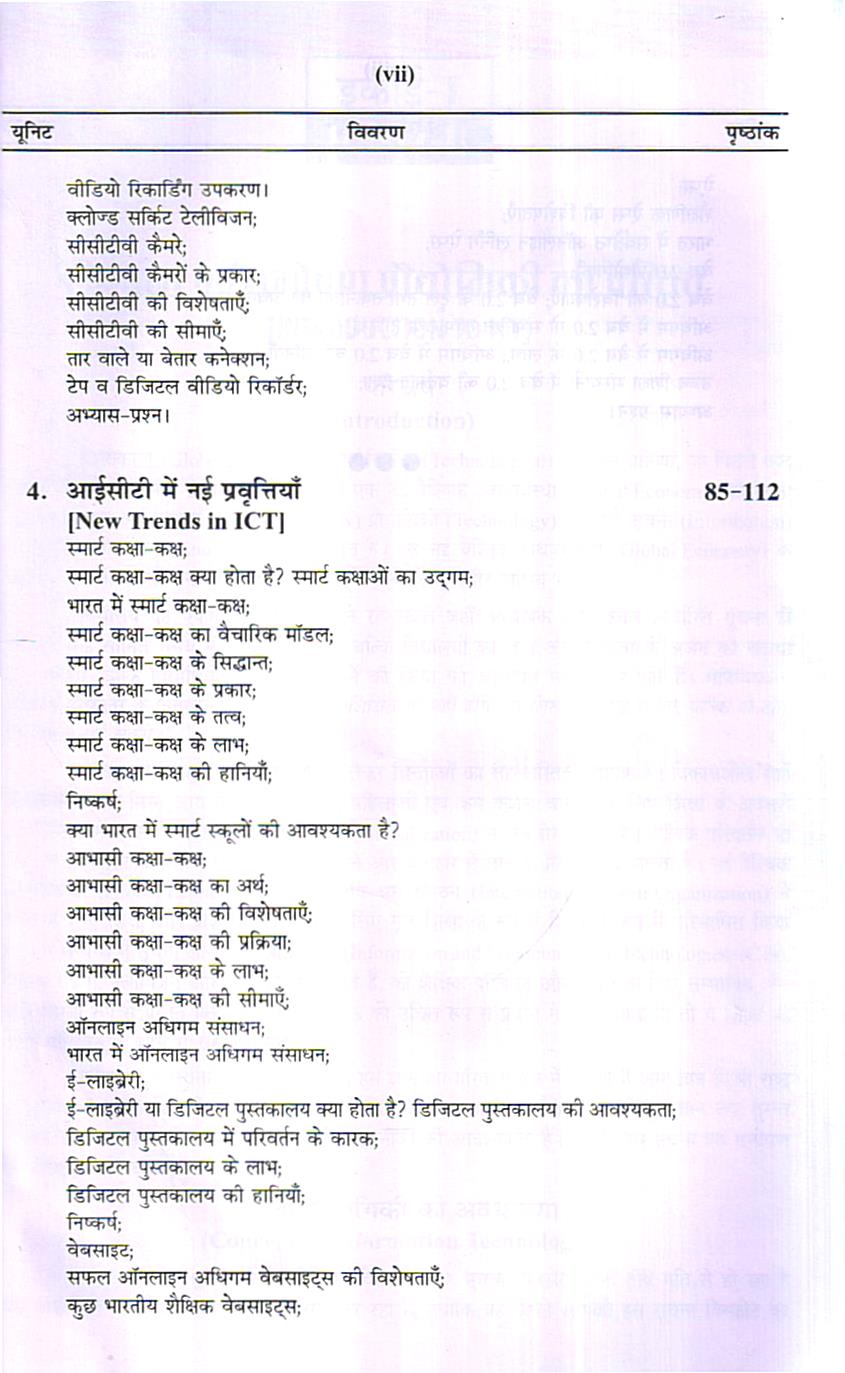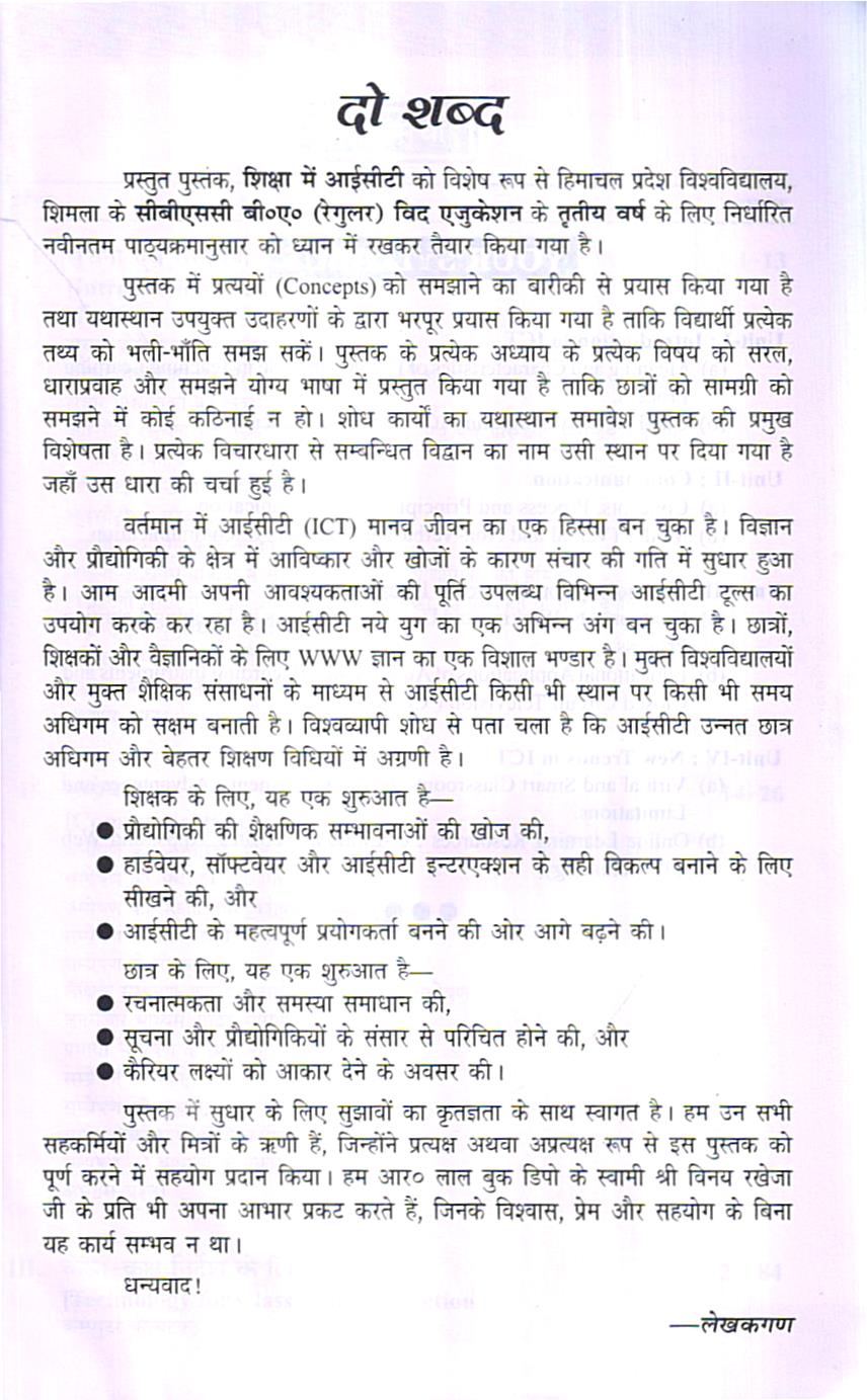 प्रस्तुत पुस्तक, शिक्षा में आईसीटी को विशेष रूप से हिमाचल प्रदेश विश्वविद्यालय, के सीबीएससी बी०ए० (रेगुलर) विद एजुकेशन के तृतीय वर्ष के लिए निर्धारित शिनितम पाठ्यक्रमानुसार को ध्यान में रखकर तैयार किया गया है।