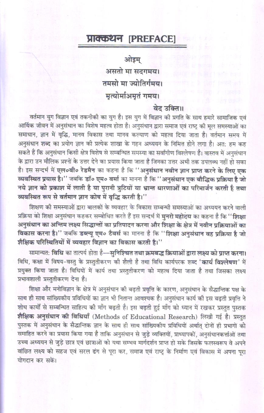 शिक्षा और मनोविज्ञान के क्षेत्र में अनुसंधान की बढ़ती प्रवृत्ति के कारण, अनुसंधान के सैद्धान्तिक पक्ष के साथ ही साथ सांख्यिकीय प्रविधियों का ज्ञान भी नितान्त आवश्यक है। अनुसंधान कार्य की इस बढ़ती प्रवृत्ति ने शोध कार्यों से सम्बन्धित साहित्य की माँग बढ़ती है। इस बढ़ती हुई माँग को ध्यान में रखकर प्रस्तुत पुस्तक शैक्षिक अनुसंधान की विधियाँ (Methods of Educational Research) लिखी गई है। प्रस्तुत पुस्तक में अनुसंधान के सैद्धान्तिक ज्ञान के साथ ही साथ सांख्यिकीय प्रविधियों अर्थात् दोनों ही प्रभागों को समाहित करने का प्रयास किया गया है ताकि अनुसंधान से जुड़े व्यक्तियों, प्राध्यापकों, अनुसंधानकर्ताओं तथा उच्च अध्ययन से जुड़े छात्र एवं छात्राओं को यथा सम्भव मार्गदर्शन प्राप्त हो सके जिसके फलस्वरूप वे अपने वांछित लक्ष्य को सहज एवं सरल ढंग से पूरा कर, समाज एवं राष्ट्र के निर्माण एवं विकास में अपना पूरा योगदान कर सकें।