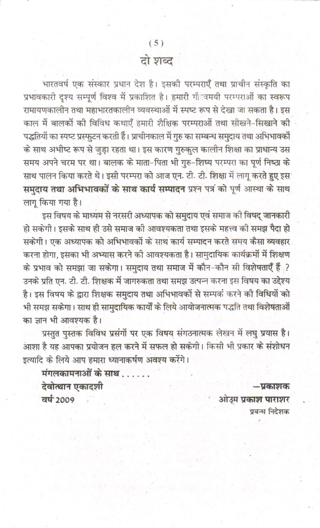 भारतवर्ष एक संस्कार प्रधान देश है। इसकी परम्पराएँ तथा प्राचीन संस्कृति का प्रभावकारी दृश्य सम्पूर्ण विश्व में प्रकाशित है। हमारी गं। वमयी परम्पराओं का स्वरूप रामायणकालीन तथा महाभारतकालीन व्यवस्थाओं में स्पष्ट रूप से देखा जा सकता है। इस काल में बालकों की विविध कथाएँ हमारी शैक्षिक परम्पराओं तथा सीखने-सिखाने की पद्धतियों का स्पष्ट प्रस्फुटन करती हैं। प्राचीनकाल में गुरु का सम्बन्ध समुदाय तथा अभिभावकों के साथ अभीष्ट रूप से जुड़ा रहता था। इस कारण गुरुकुल कालीन शिक्षा का प्राधान्य उस समय अपने चरम पर था। बालक के माता-पिता भी गुरु-शिष्य परम्परा का पूर्ण निष्ठा के साथ पालन किया करते थे। इसी परम्परा को आज एन. टी. टी. शिक्षा में लागू करते हुए इस समुदाय तथा अभिभावकों के साथ कार्य सम्पादन प्रश्न पत्र को पूर्ण आस्था के साथ लागू किया गया है।