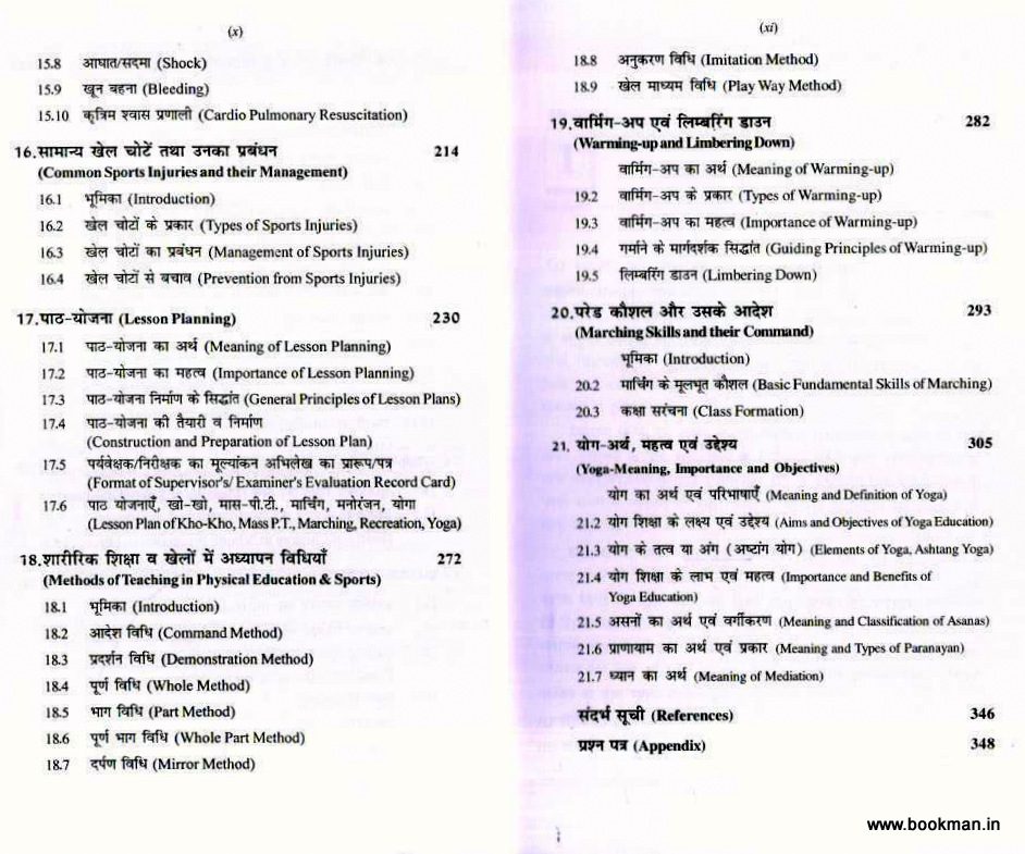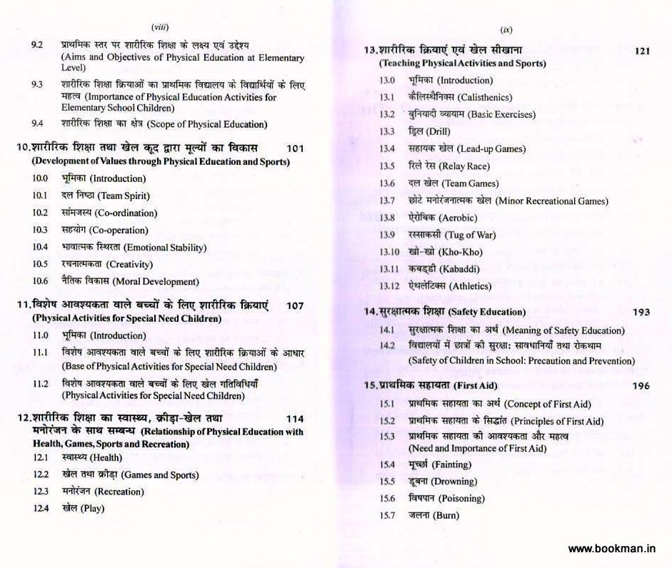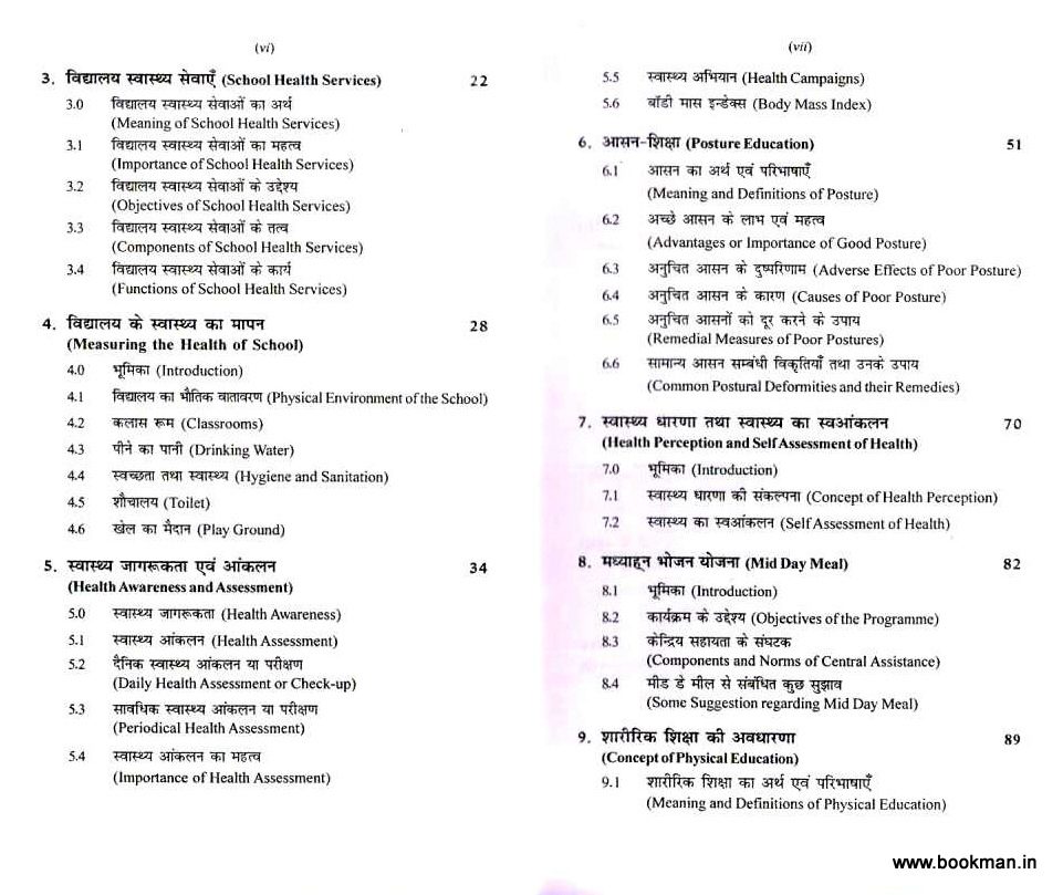 स्वास्थ्य, योग एवं शारीरिक शिक्षा के क्षेत्र में आधुनिक विचारों तथा नवीनतम प्रयोगों, जैसे:- स्वास्थ्य एवं कुशलक्षेम व्यक्तिगत स्वच्छता, विद्यालय स्वास्थ्य सेवाएँ विद्यालय के स्वास्थ्य का मापन, स्वास्थ्य जागरूकता एवं आंकलन, आसन-शिक्षा, मध्याहन भोजन योजना, शारीरिक शिक्षा की अवधारणा, खेलकूद द्वारा मूल्यों का विकास विशेष आवश्यकता वाले बच्चों के लिए शारीरिक क्रियाएँ, प्राथमिक सहायता, सामान्य खेल चोटें तथा अकल प्रबंधन, पाठ योजना, शारीरिक शिक्षा व खेलों में अध्यापन पद्धतियाँ, वार्मिंग-अप एवं लिम्बरिंग डाउन कौशल, एथलेटिक्स, योग-अर्थ, महत्व एवं उद्देश्य, आदि का इसमें यथोचित वर्णन किया गया है।