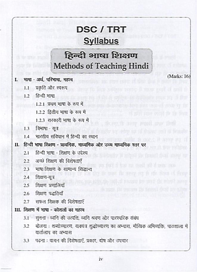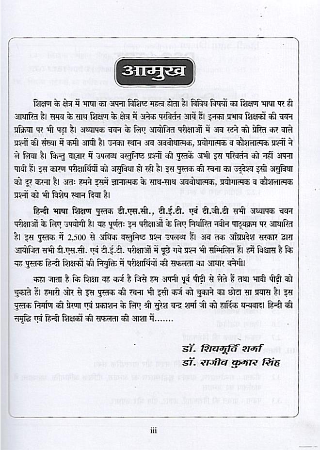 हिन्दी भाषा शिक्षण पुस्तक डी.एस.सी., टी.ई.टी. एवं टी.जी.टी सभी अध्यापक चयन परीक्षाओं के लिए उपयोगी है। यह पूर्णतः इन परीक्षाओं के लिए निर्धारित नवीन पाठ्यक्रम पर आधारित है। इस पुस्तक में 2,500 से अधिक वस्तुनिष्ठ प्रश्न उपलब्ध हैं। अब तक आँध्रप्रदेश सरकार द्वारा आयोजित सभी डी.एस.सी. एवं टी.ई.टी. परीक्षाओं में पूछे गये प्रश्न भी सम्मिलित हैं। हमें विश्वास है कि यह पुस्तक हिन्दी शिक्षकों की नियुक्ति में परीक्षार्थियों की सफलता का आधार बनेगी।