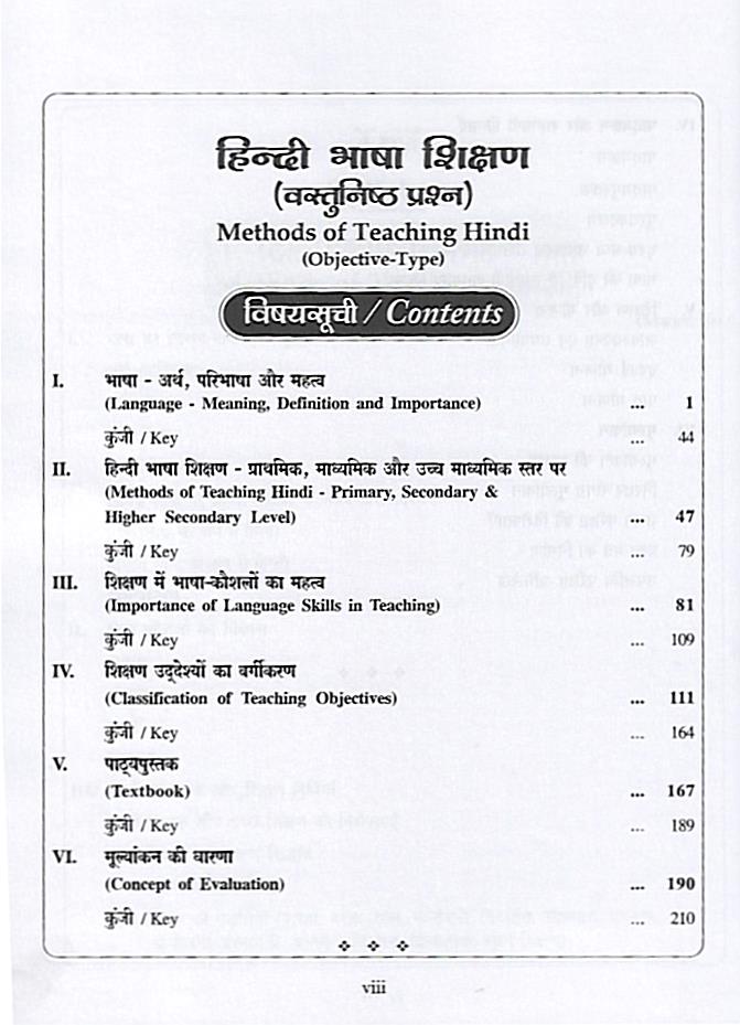 शिक्षण के क्षेत्र में भाषा का अपना विशिष्ट महत्व होता है। विविध विषयों का शिक्षण भाषा पर ही आधारित है। समय के साथ शिक्षण के क्षेत्र में अनेक परविर्तन आयें हैं। इनका प्रभाव शिक्षकों की चयन प्रक्रिया पर भी पड़ा है। अध्यापक वयन के लिए आयोजित परीक्षाओं में अब रटने को प्रेरित कर वाले प्रश्नों की संख्या में कमी आयी है। उनका स्थान अब अवबोधात्मक, प्रयोगात्मक व कौशलात्मक प्रश्नों ने ले लिया है। किन्तु बाज़ार में उपलव्य वस्तुनिष्ठ प्रश्नों की पुस्तकें अभी इस परिवर्तन को नहीं अपना पायी हैं। इस कारण परीक्षार्थियों को असुविधा हो रही है। इस पुस्तक की रचना का उद्देश्य इसी असुविधा को दूर करना है। अतः हमने इसमें ज्ञानात्मक के साथ-साथ अवबोधात्मक, प्रयोगात्मक व कौशलात्मक प्रश्नों को भी विशेष स्थान दिया है।