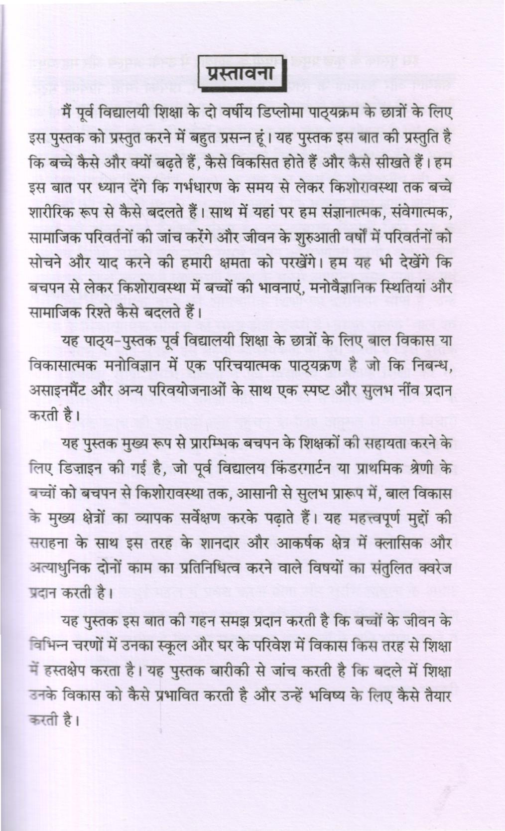 मैं पूर्व विद्यालयी शिक्षा के दो वर्षीय डिप्लोमा पाठ्यक्रम के छात्रों के लिए इस पुस्तक को प्रस्तुत करने में बहुत प्रसन्न हूं। यह पुस्तक इस बात की प्रस्तुति है कि बच्चे कैसे और क्यों बढ़ते हैं, कैसे विकसित होते हैं और कैसे सीखते हैं। हम इस बात पर ध्यान देंगे कि गर्भधारण के समय से लेकर किशोरावस्था तक बच्चे शारीरिक रूप से कैसे बदलते हैं। साथ में यहां पर हम संज्ञानात्मक, संवेगात्मक, सामाजिक परिवर्तनों की जांच करेंगे और जीवन के शुरुआती वर्षों में परिवर्तनों की सोचने और याद करने की हमारी क्षमता को परखेंगे। हम यह भी देखेंगे कि बचपन से लेकर किशोरावस्था में बच्चों की भावनाएं, मनोवैज्ञानिक स्थितियां और सामाजिक रिश्ते कैसे बदलते हैं।