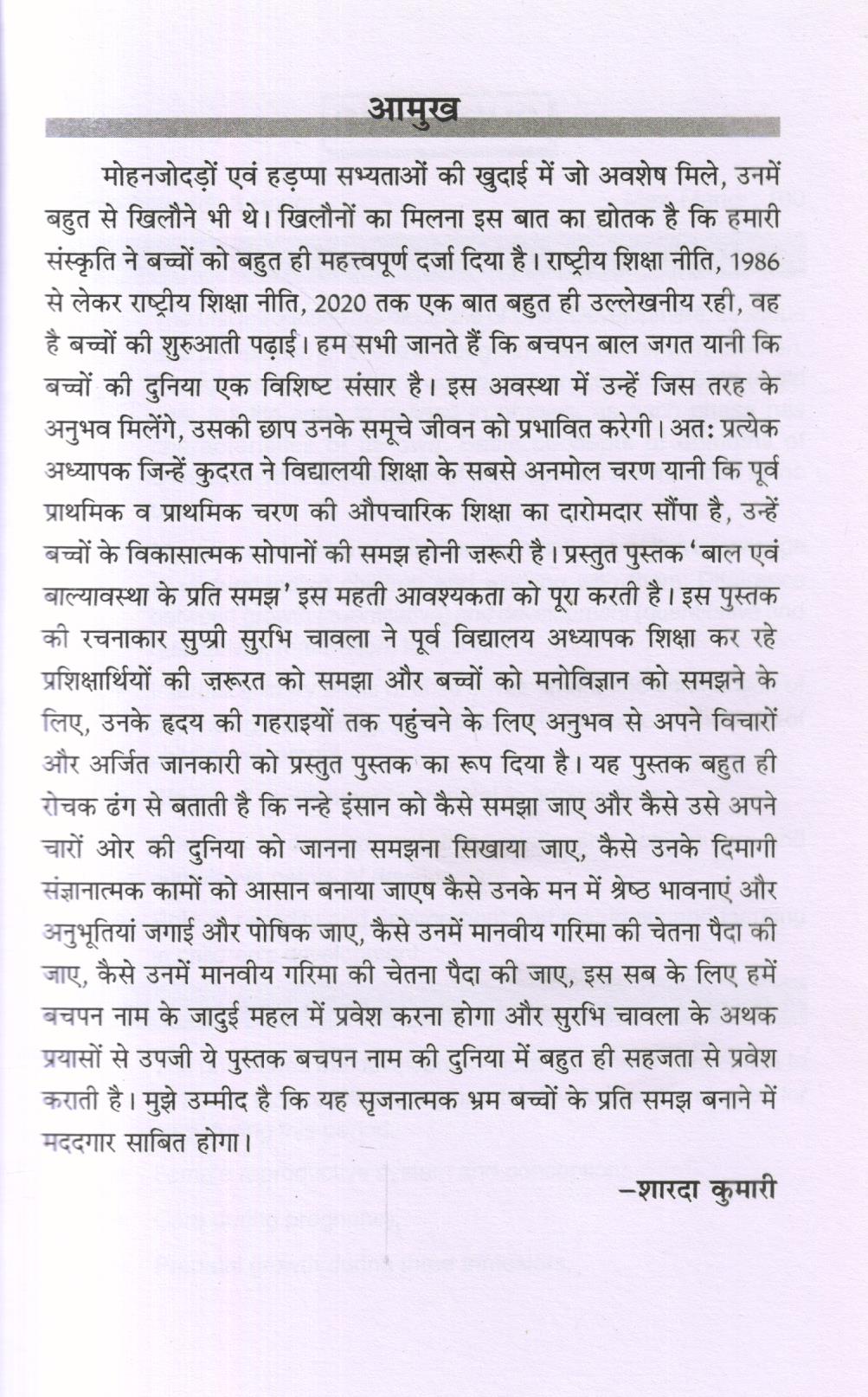 यह पुस्तक मुख्य रूप से प्रारम्भिक बचपन के शिक्षकों की सहायता करने के लिए डिजाइन की गई है, जो पूर्व विद्यालय किंडरगार्टन या प्राथमिक श्रेणी के बच्चों को बचपन से किशोरावस्था तक, आसानी से सुलभ प्रारूप में, बाल विकास के मुख्य क्षेत्रों का व्यापक सर्वेक्षण करके पढ़ाते हैं। यह महत्त्वपूर्ण मुद्दों की सराहना के साथ इस तरह के शानदार और आकर्षक क्षेत्र में क्लासिक और अत्याधुनिक दोनों काम का प्रतिनिधित्व करने वाले विषयों का संतुलित क्वरेज प्रदान करती है।