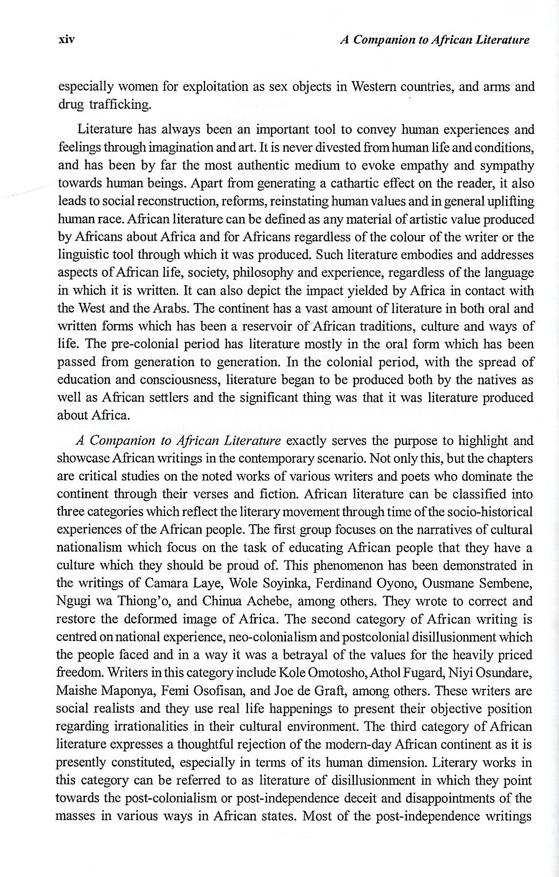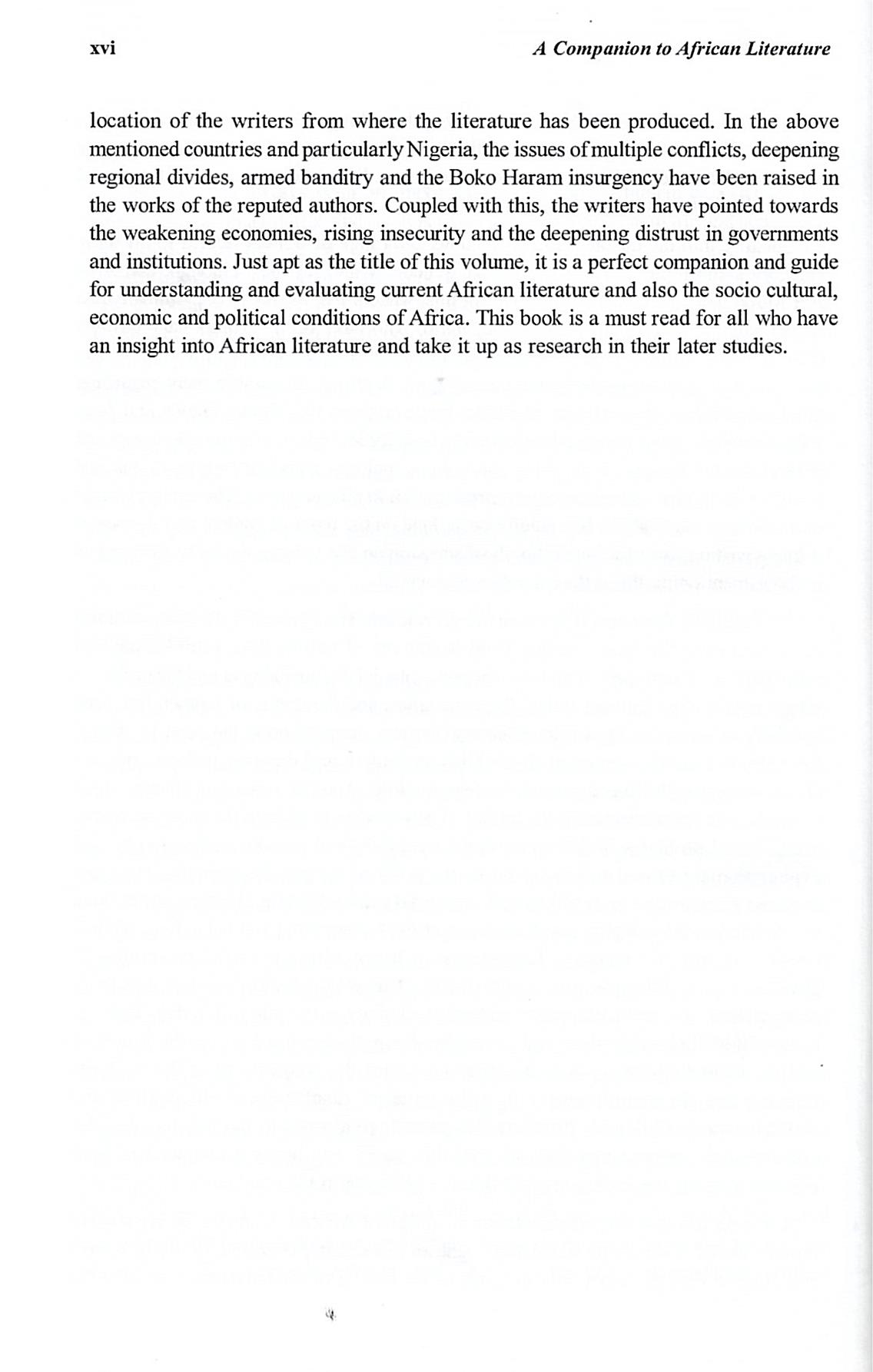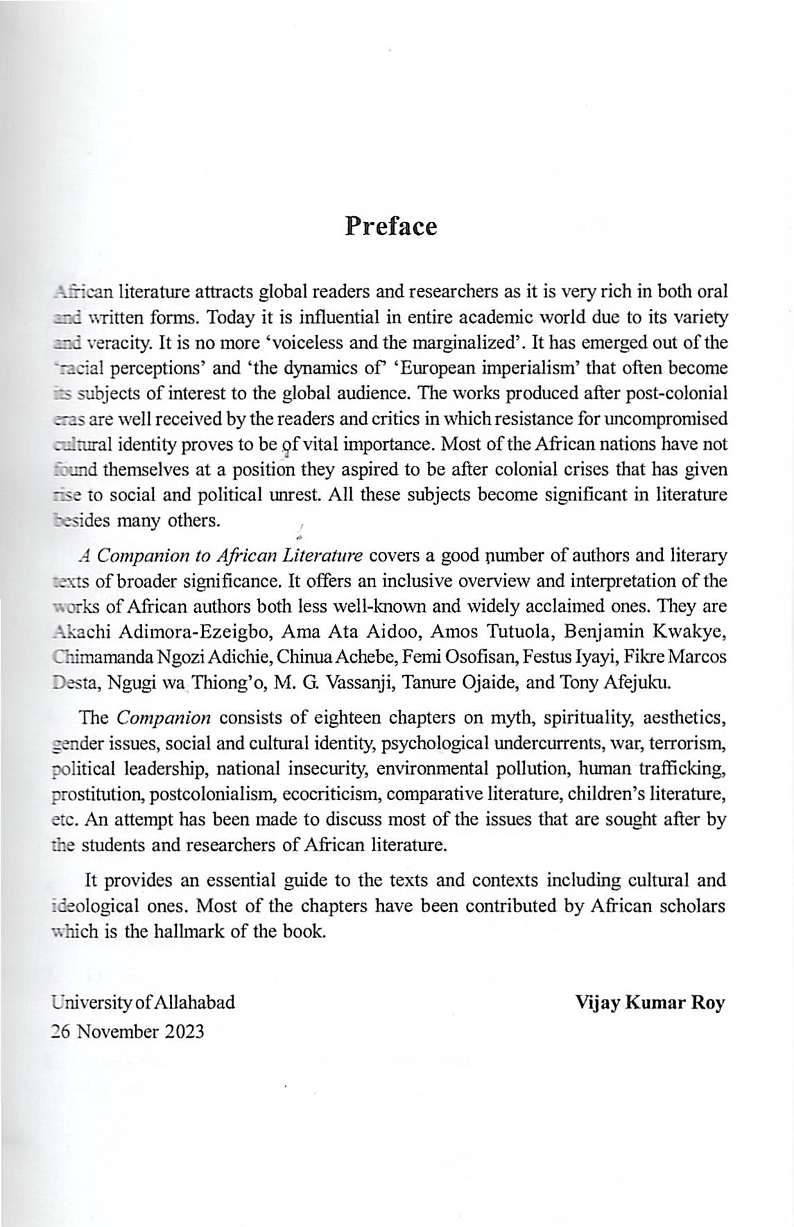 The Companion consists of eighteen chapters on myth, spirituality, aesthetics, gender issues, social and cultural identity, psychological undercurrents, war, terrorism, political leadership, national insecurity, environmental pollution, human trafficking, prostitution, postcolonialism, ecocriticism, comparative literature, children’s literature, etc. An attempt has been made to discuss most of the issues that are sought after by the students and researchers of African literature.